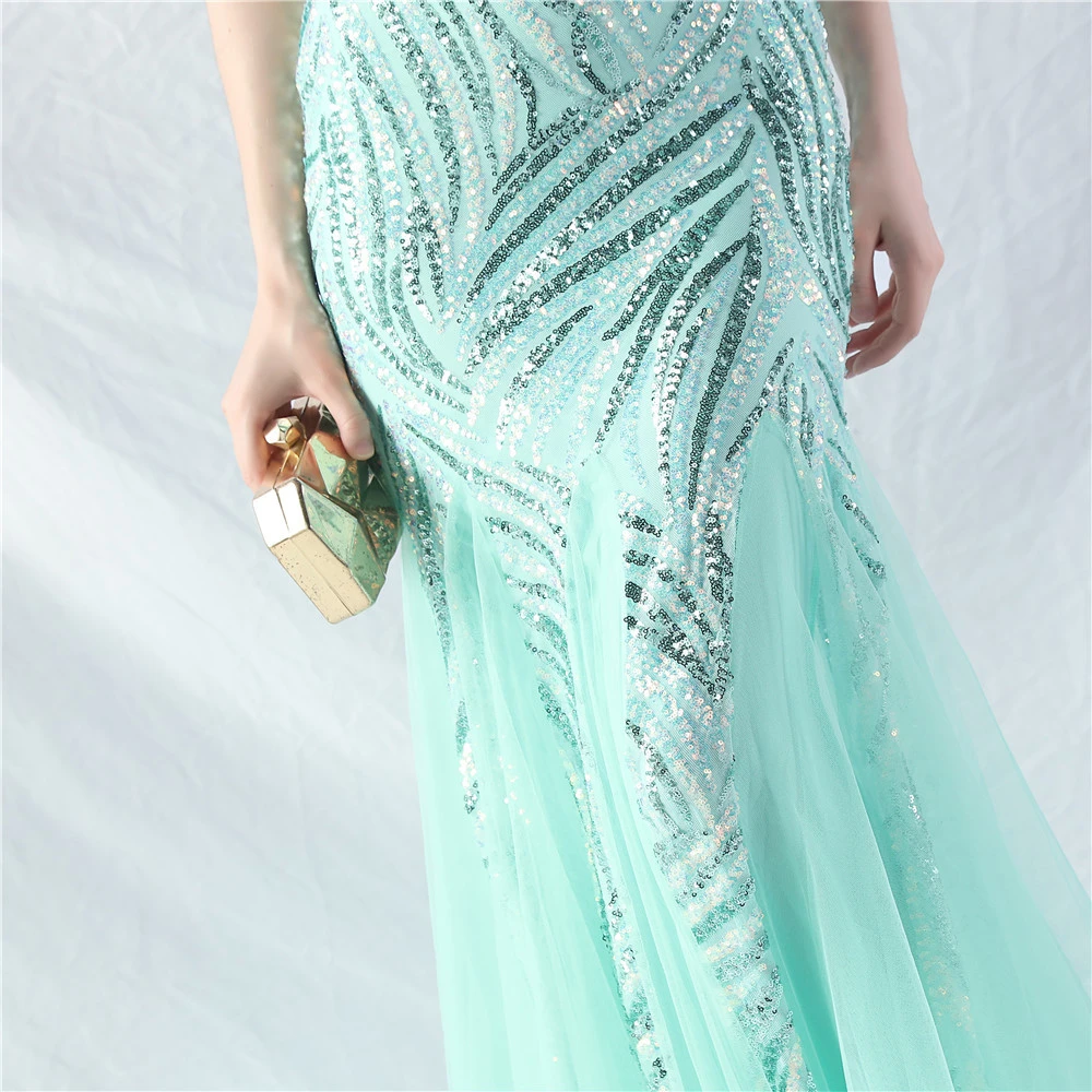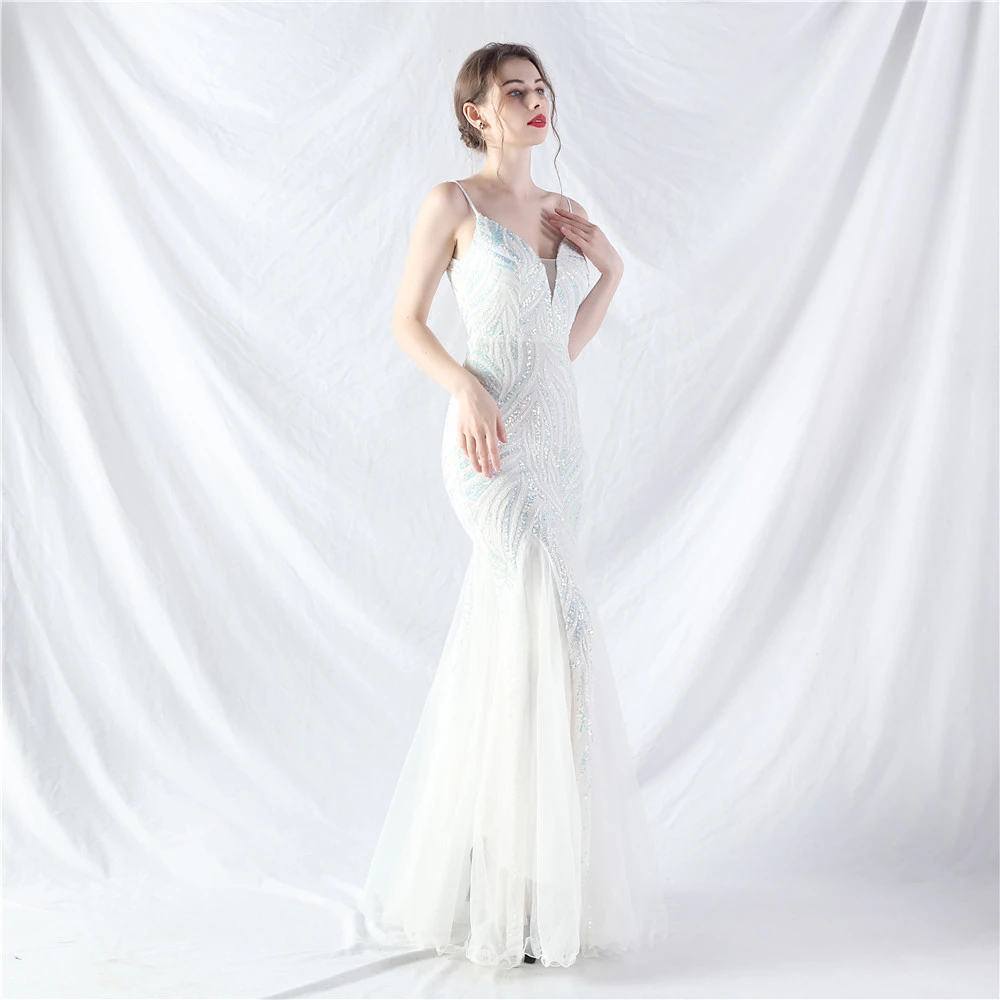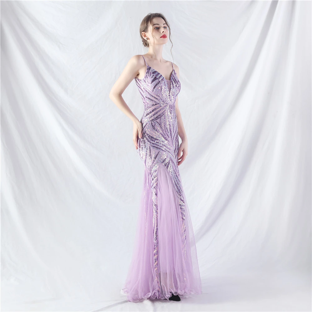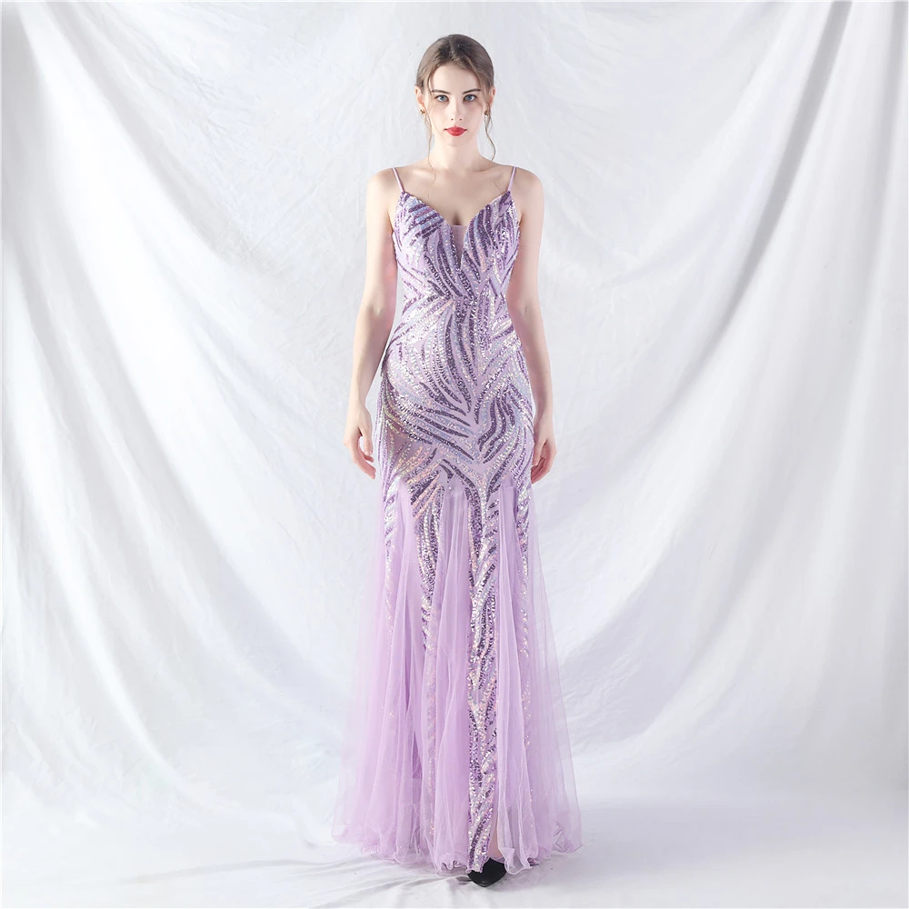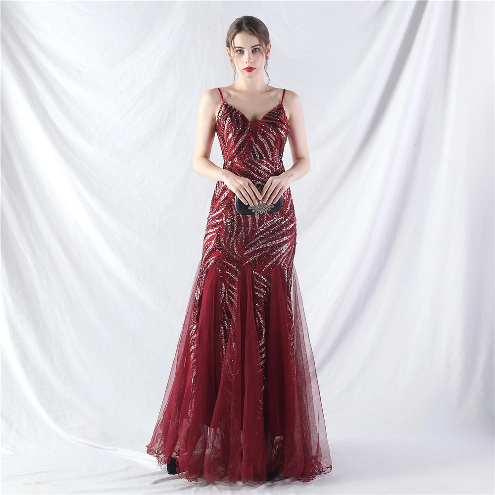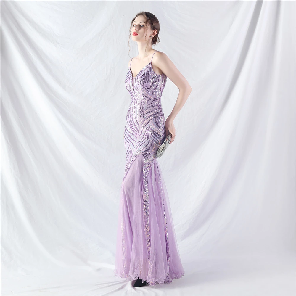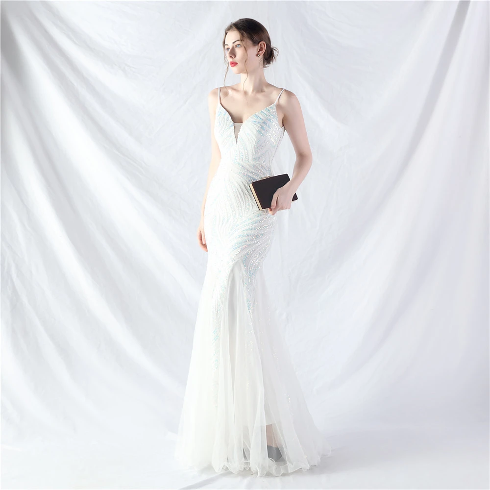Stacked Sequins Splicing Mesh Gauze Sling Evening Dress