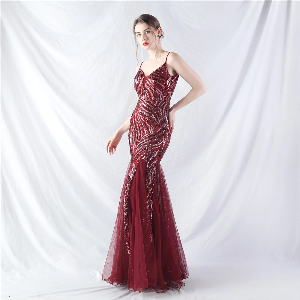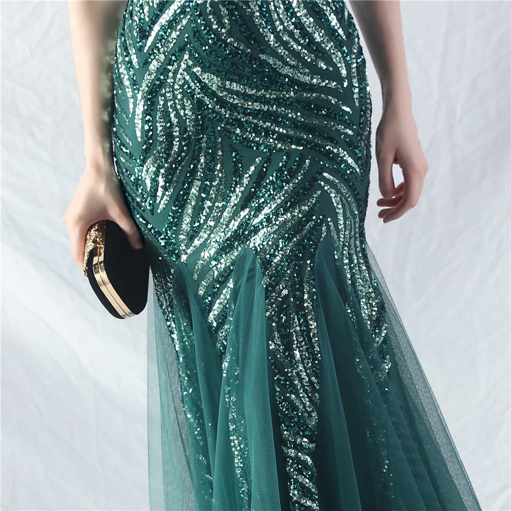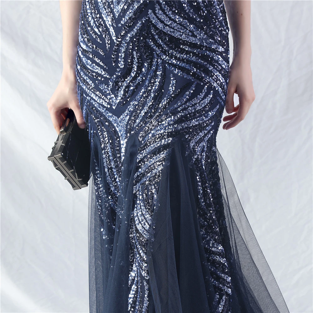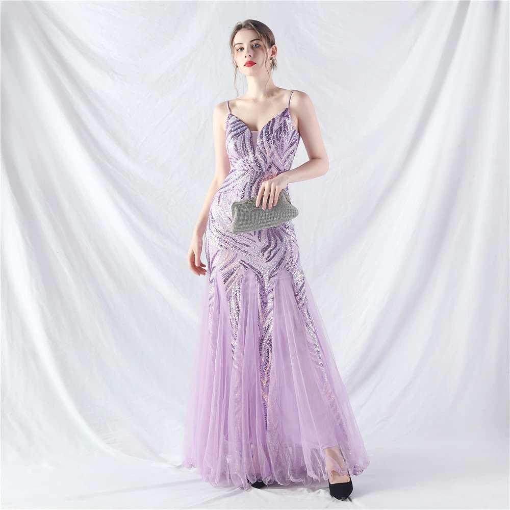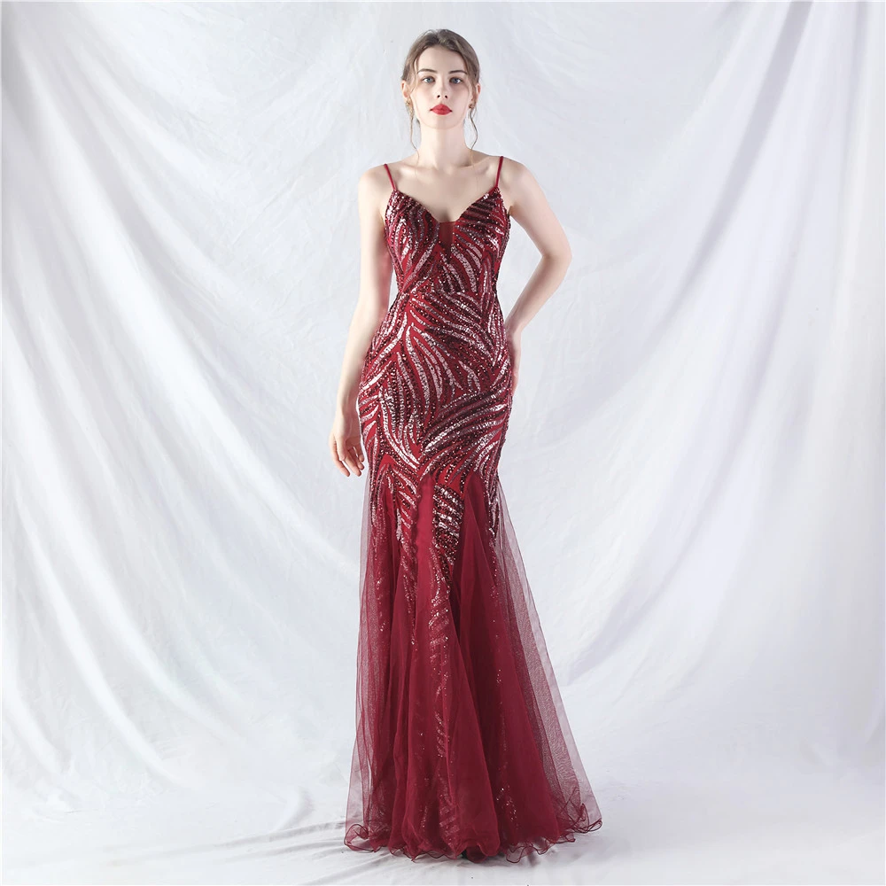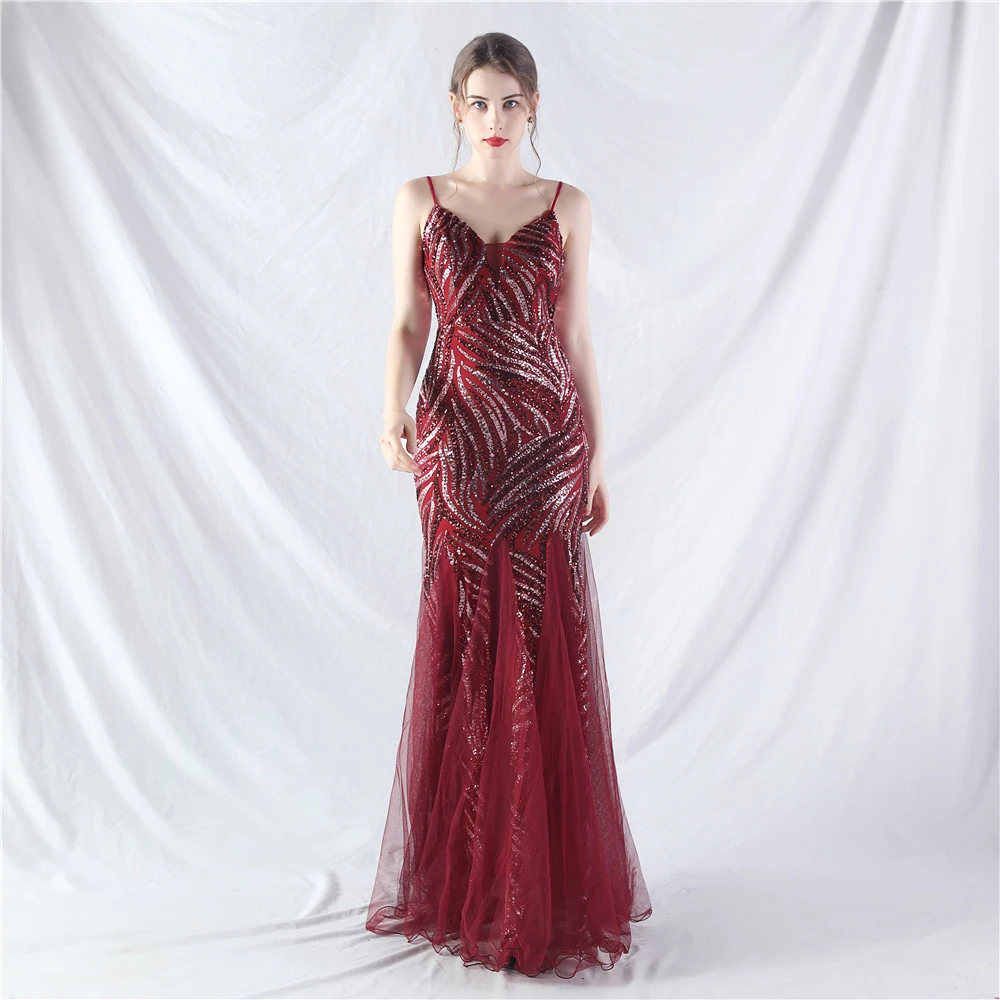 Stacked Sequins Splicing Mesh Gauze Sling Evening Dress