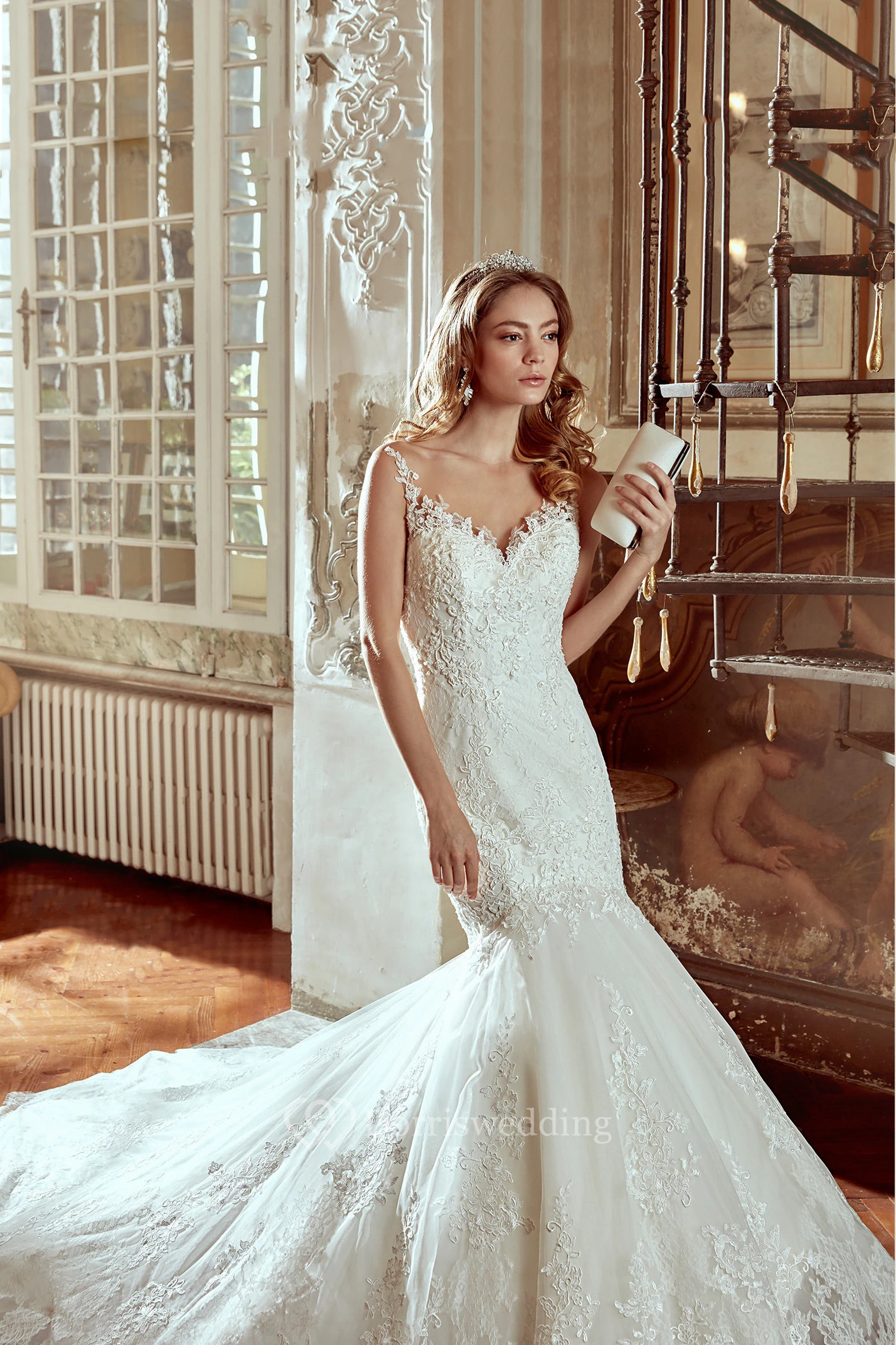 Strap-Neck Lace Wedding Dress with Mermaid Style and Illusive Back