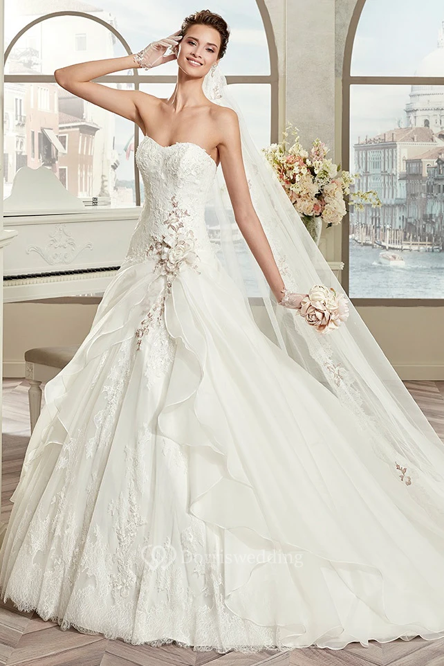 Strapless A-Line Bridal Gown With Floral Decorations And Ruffles