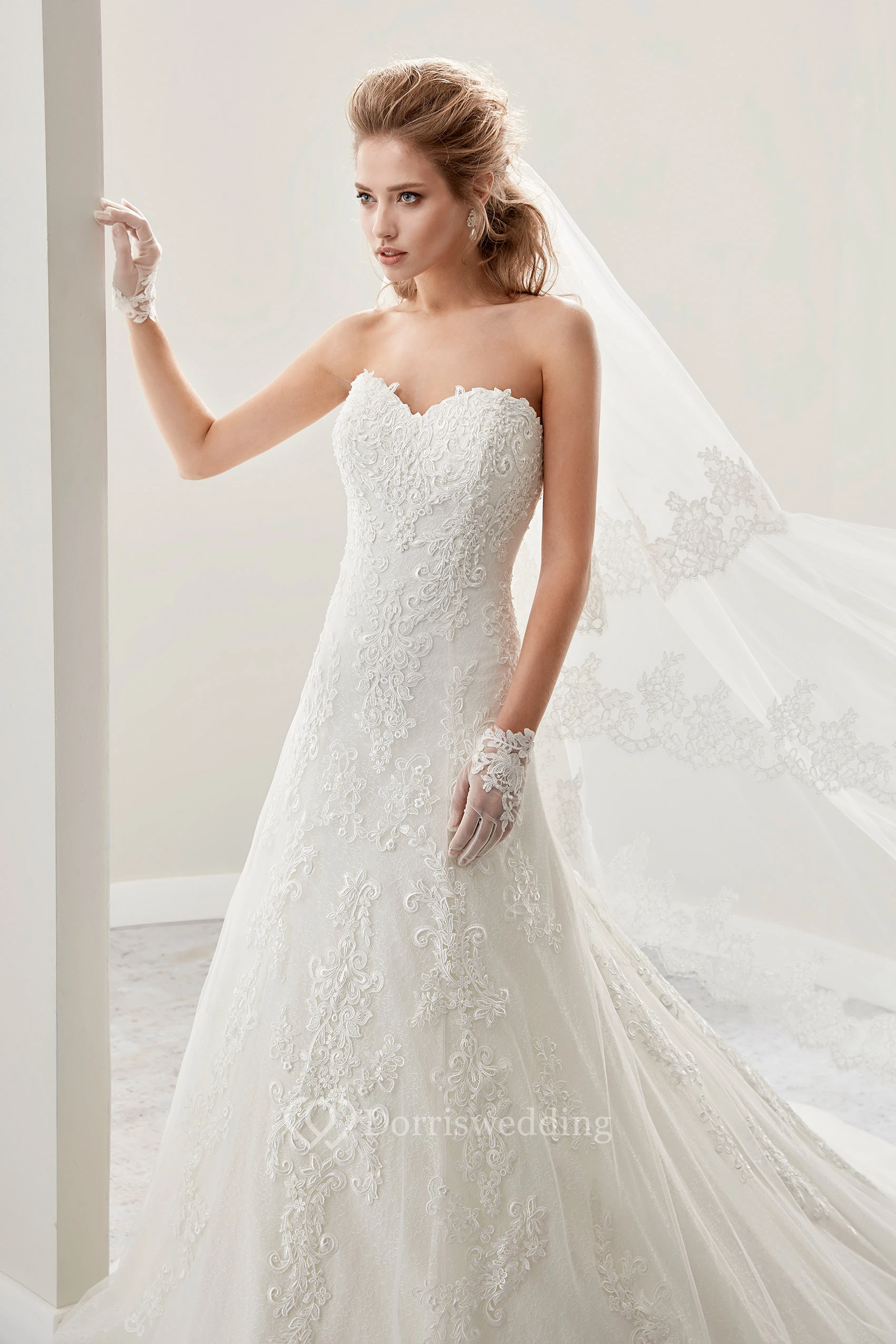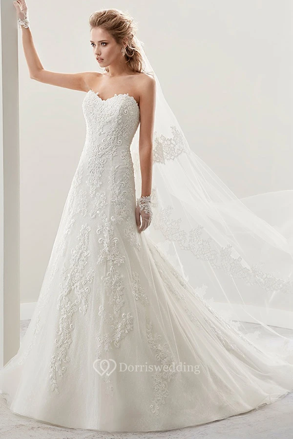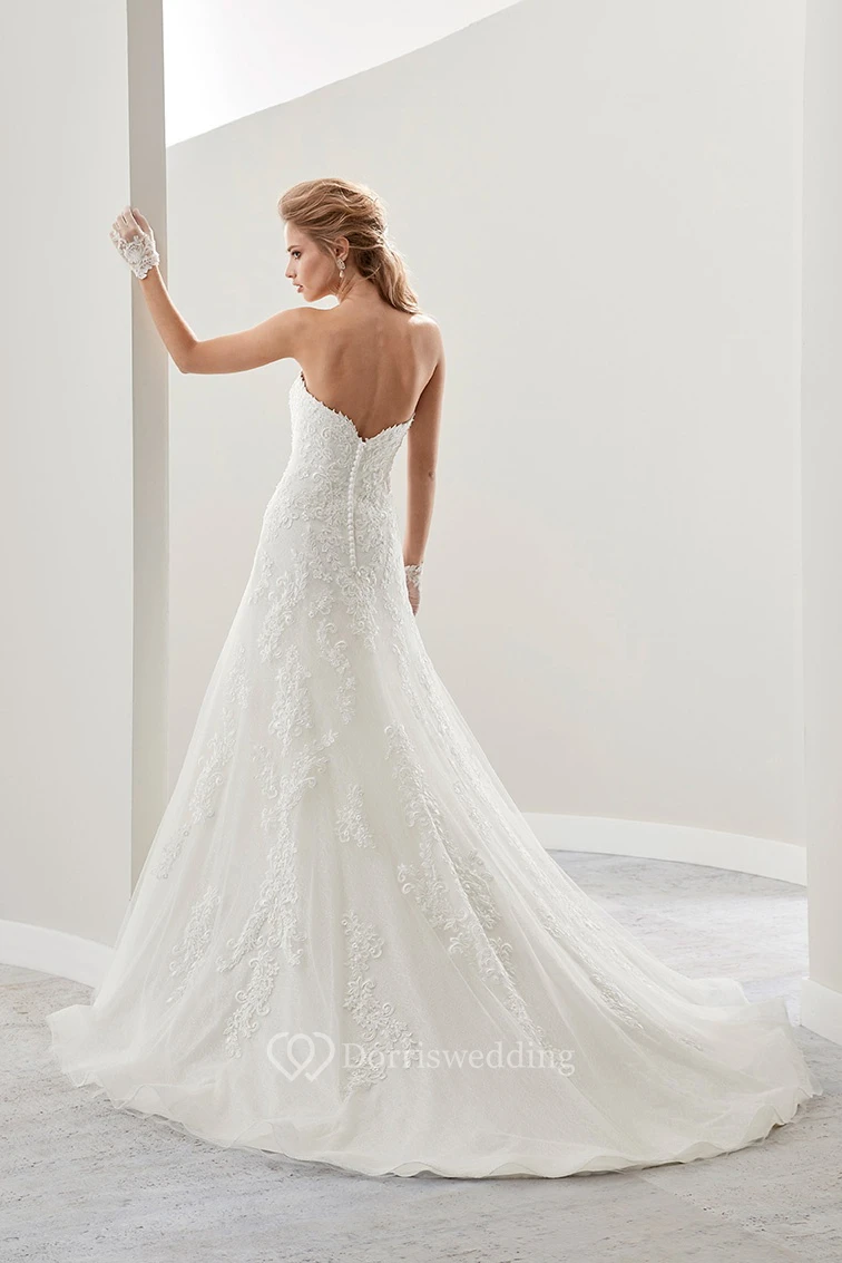 Strapless A-Line Lace Bridal Gown With Embroidered Lace And Half Back
