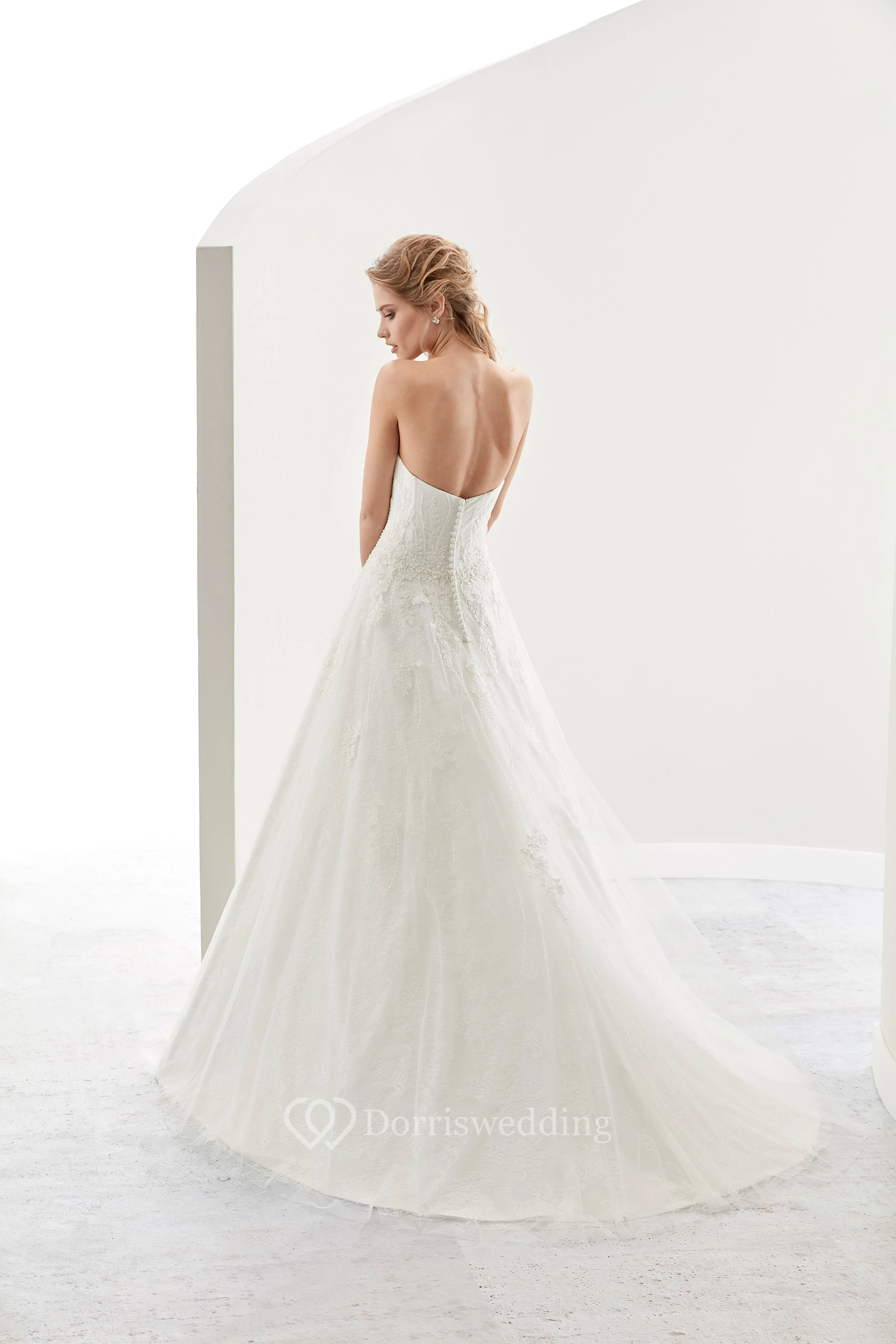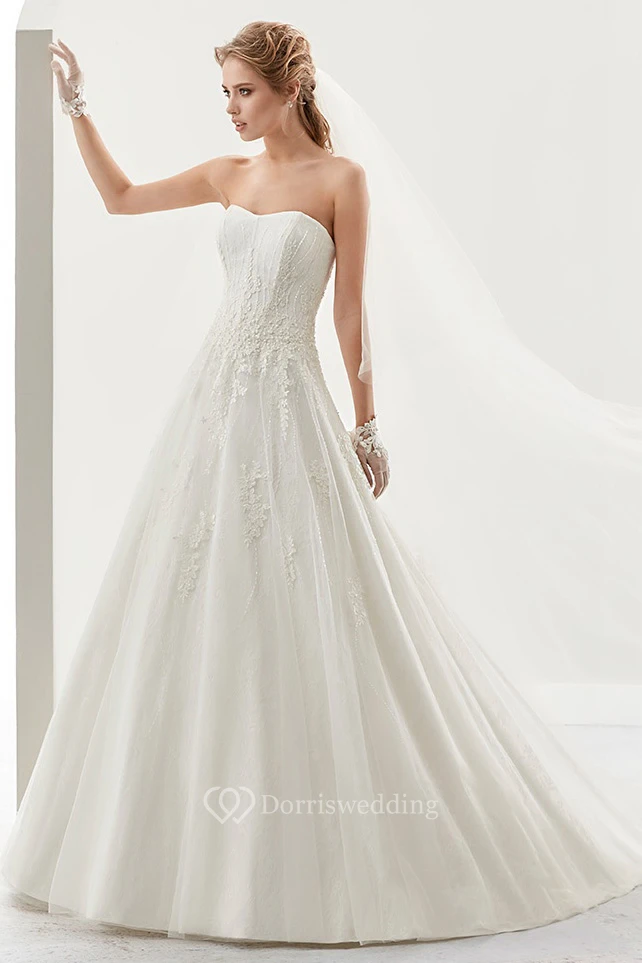 Strapless A-Line Lace Bridal Gown With Fine Appliques And Brush Train