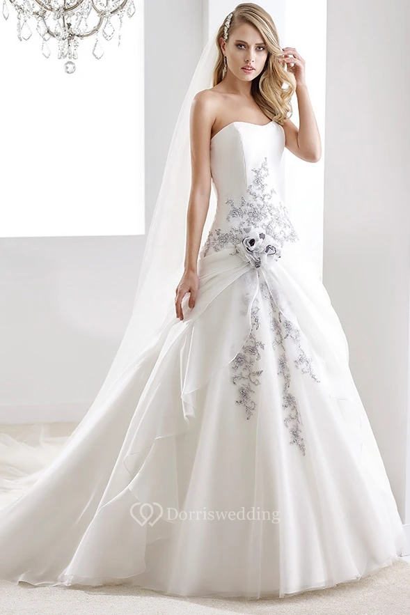 Strapless A-line Satin Dress with Striking Appliques and Flower Ruching
