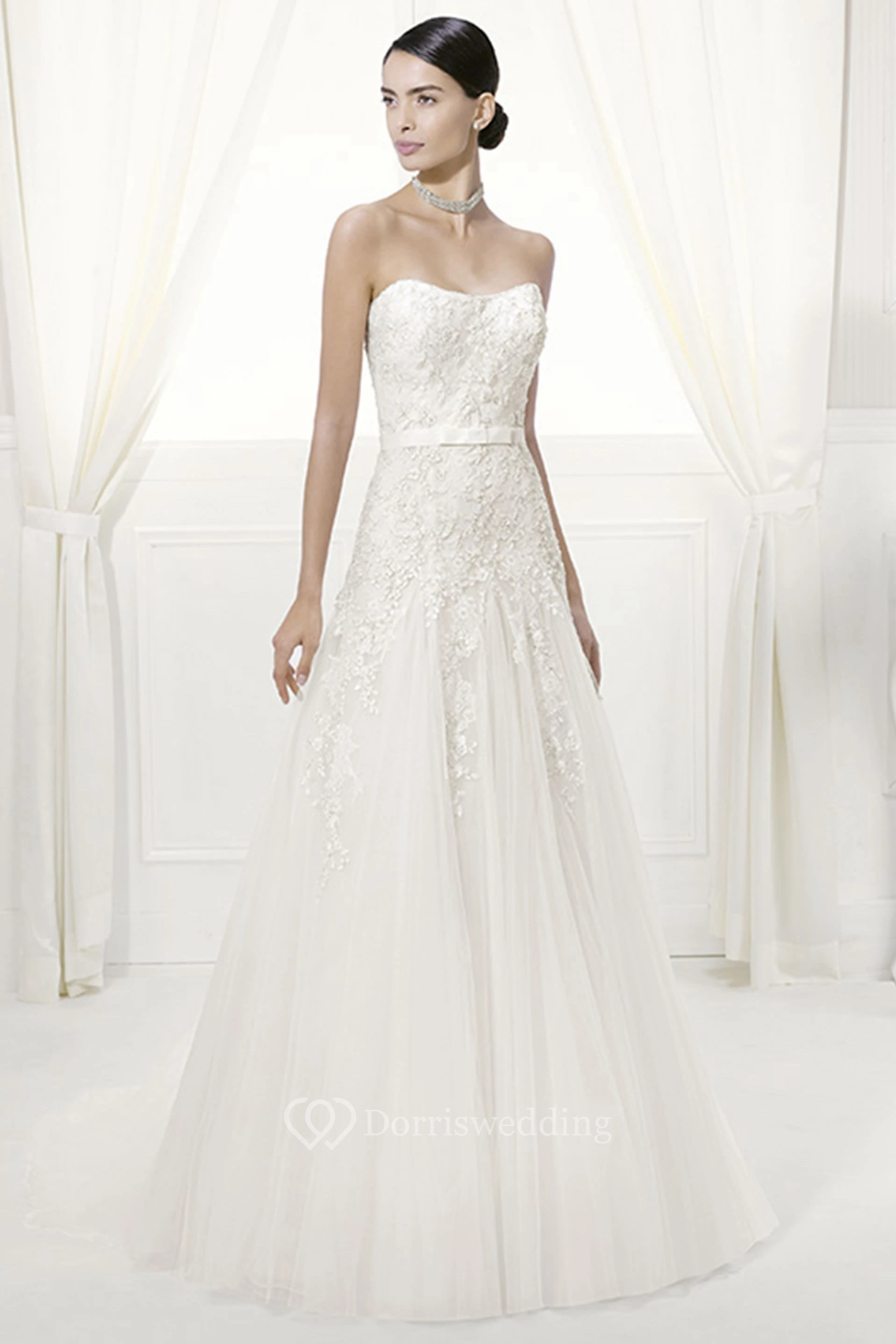 Strapless A-Line Tulle Bridal Gown With Belt And Lace