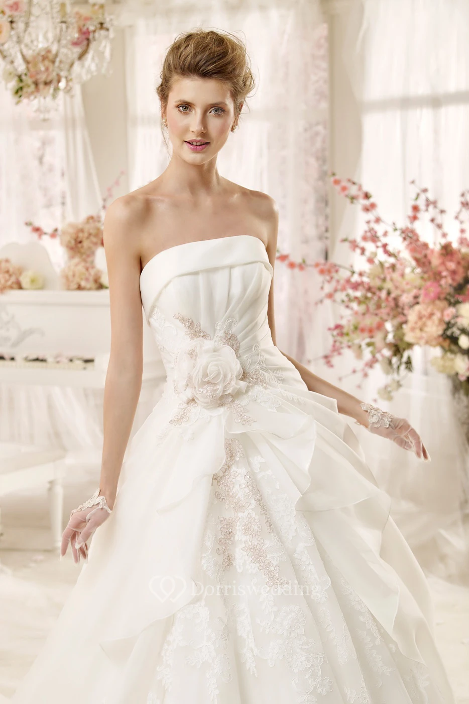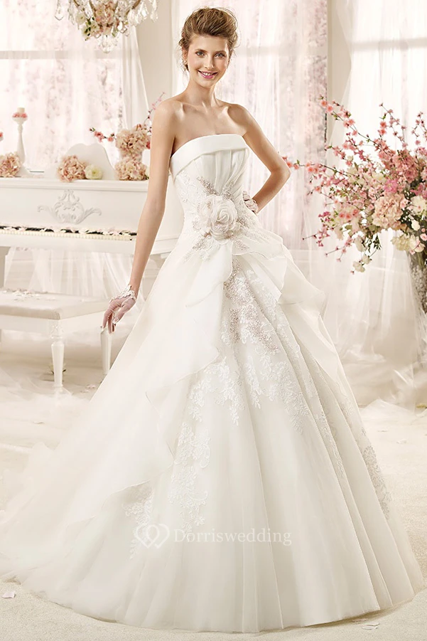 Strapless A-line Wedding Dress with Flowers and Pleated Bodice
