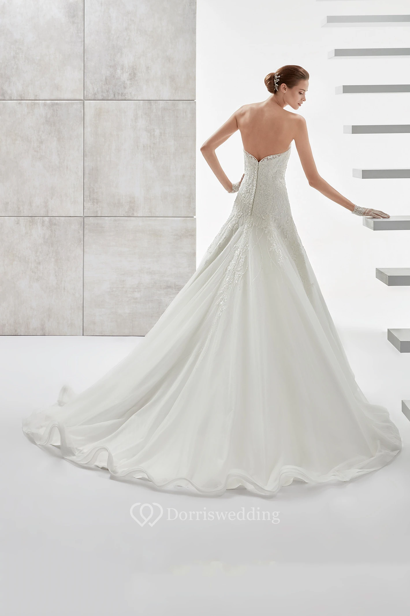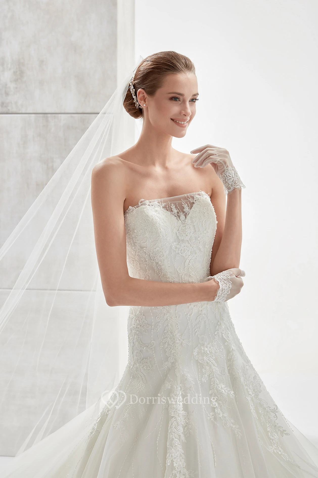Strapless A-line Wedding Dress with Lace Bodice and Asymmetrical Ruffles