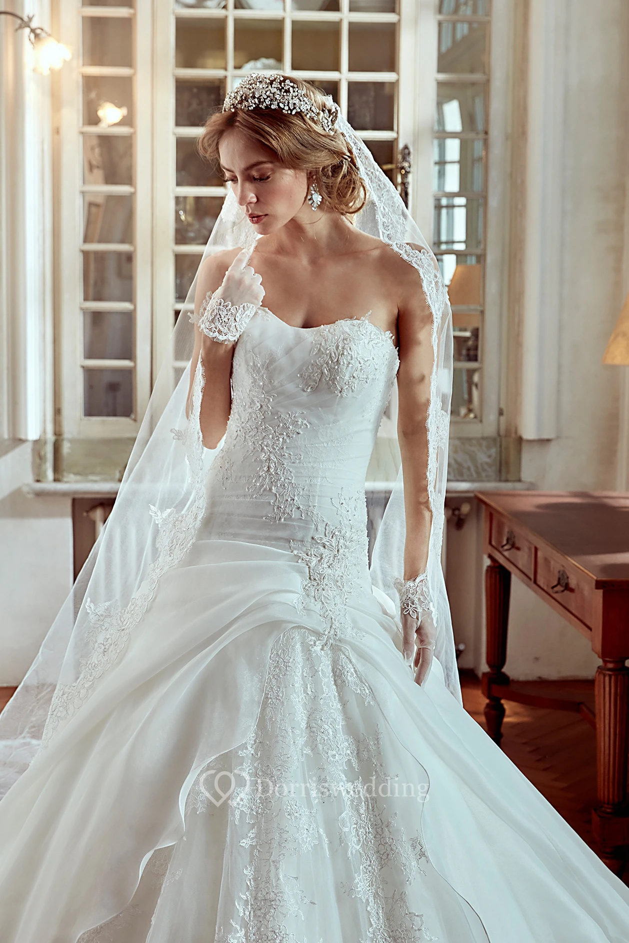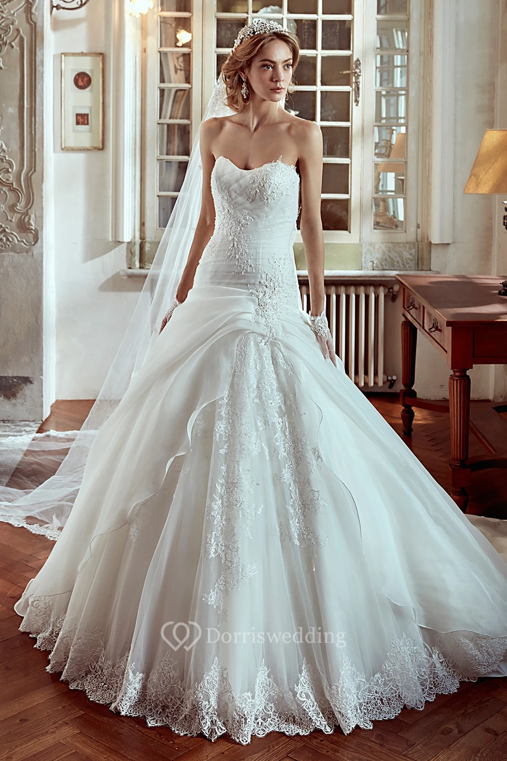 Strapless A-line Wedding Dress With Side Draping and Lace Appliques