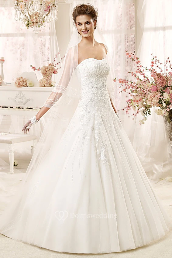 Strapless A-line Wedding Gown with Lace Appliques and Brush Train