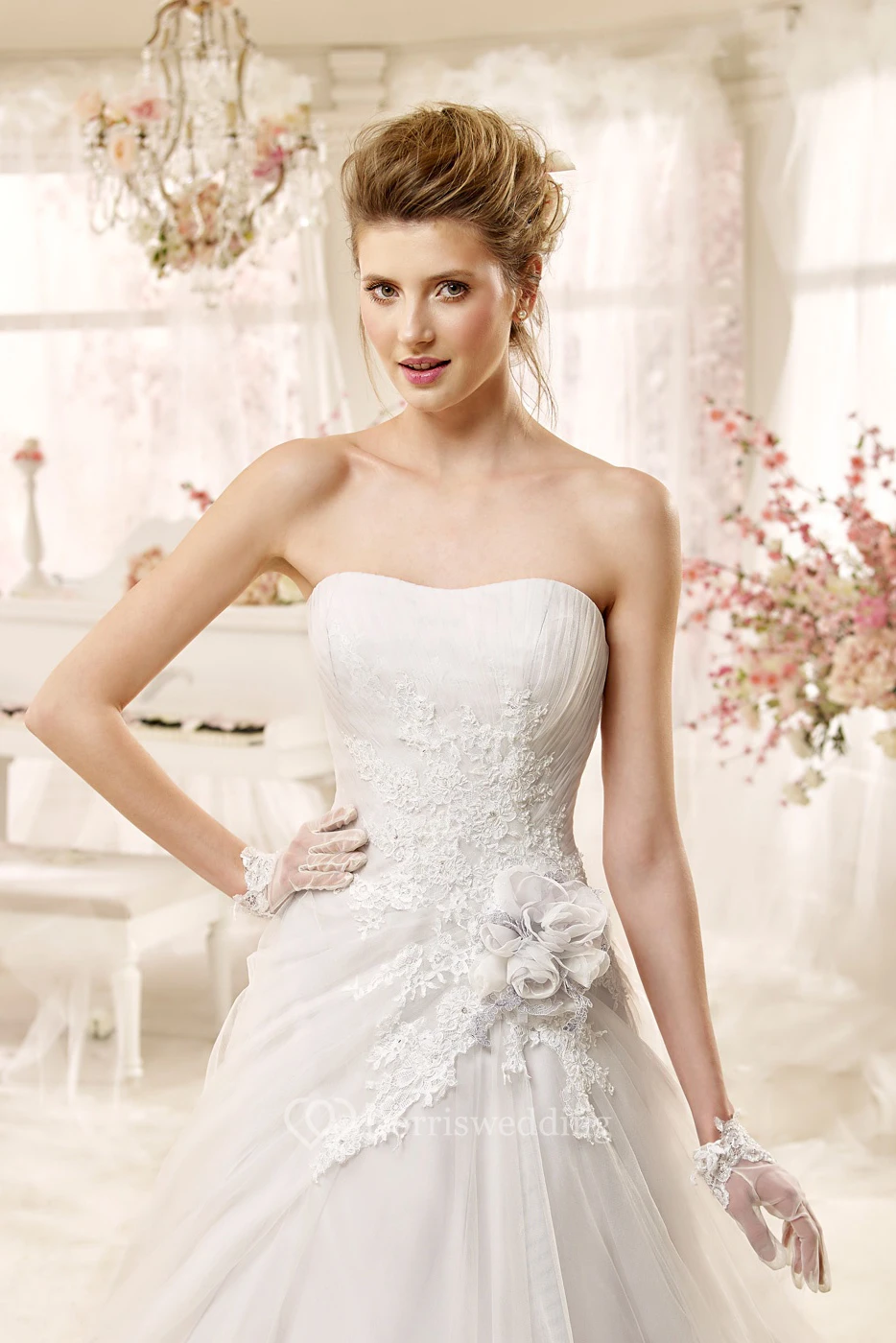 Strapless Applique A-line Wedding Dress With Flowers and Asymmetrical Overlayer