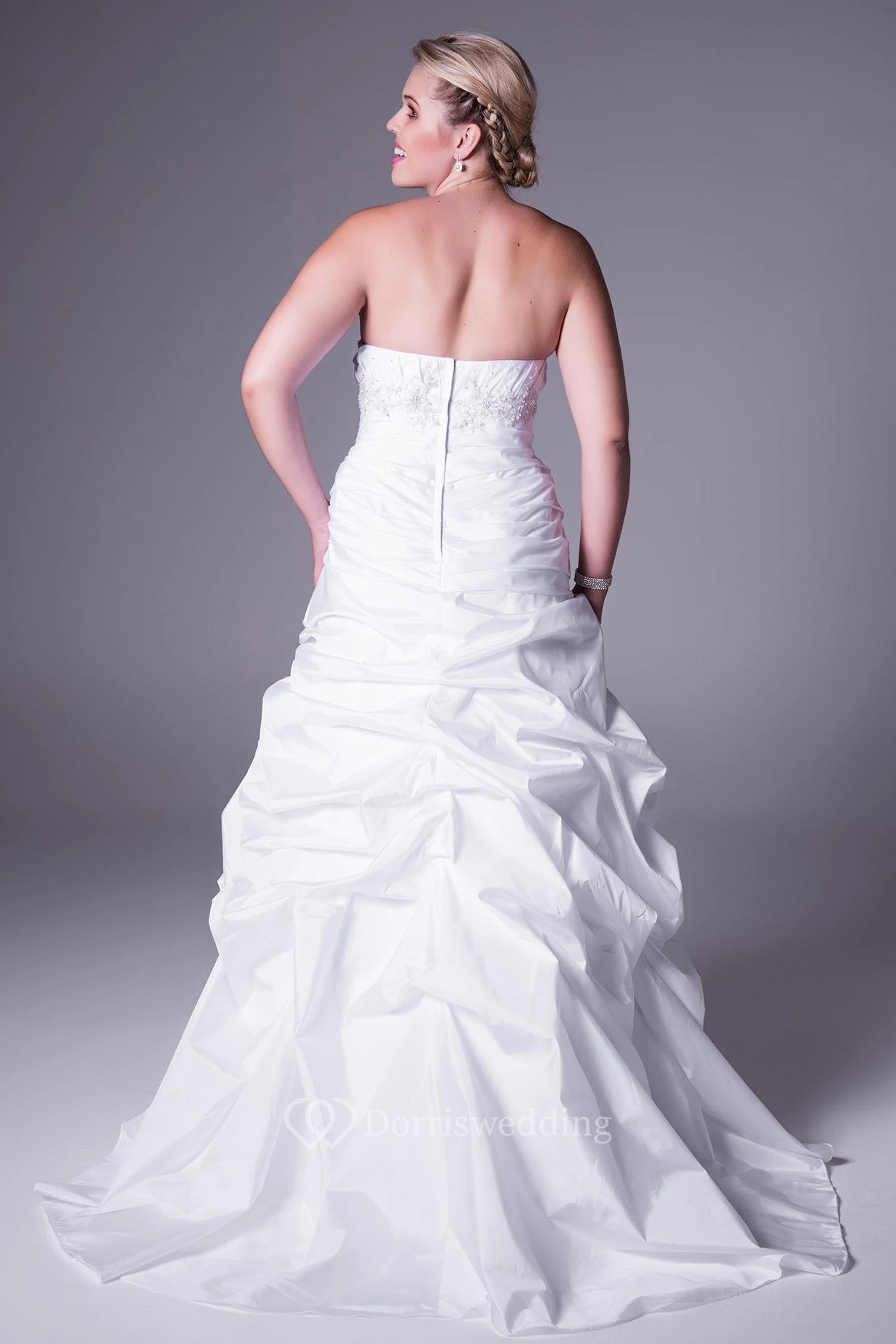 Strapless Appliqued Satin Plus Size Wedding Dress With Ruffles And Sweep Train