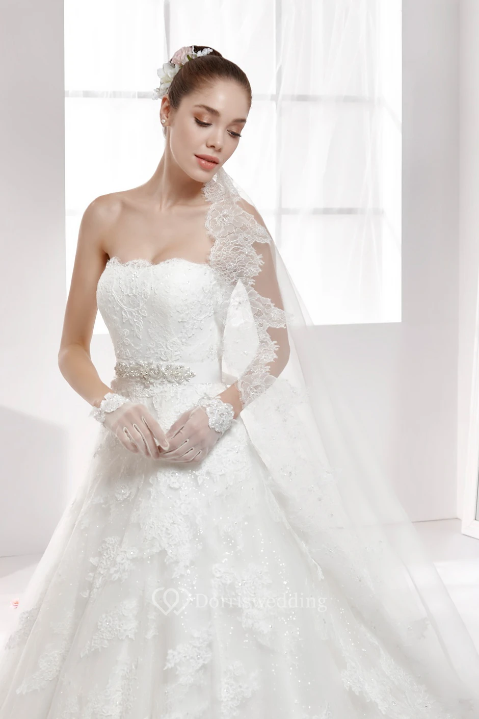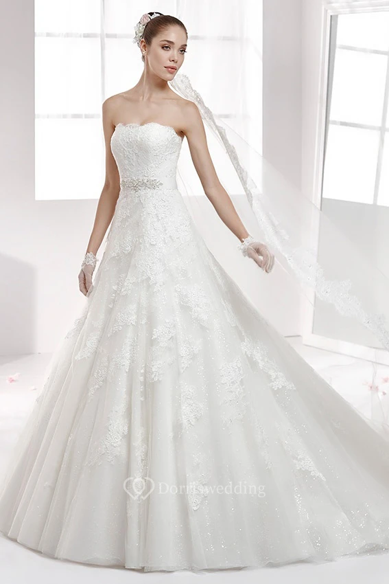 Strapless Back-Bow A-Line Lace Wedding Dress With Beaded Waist And Brush Train