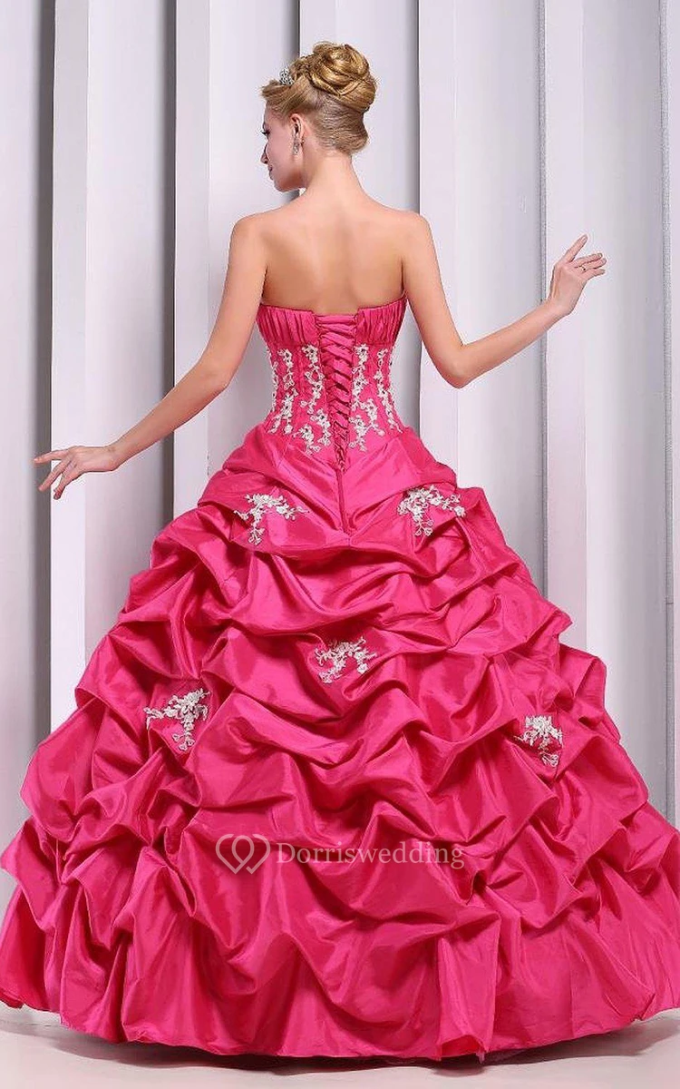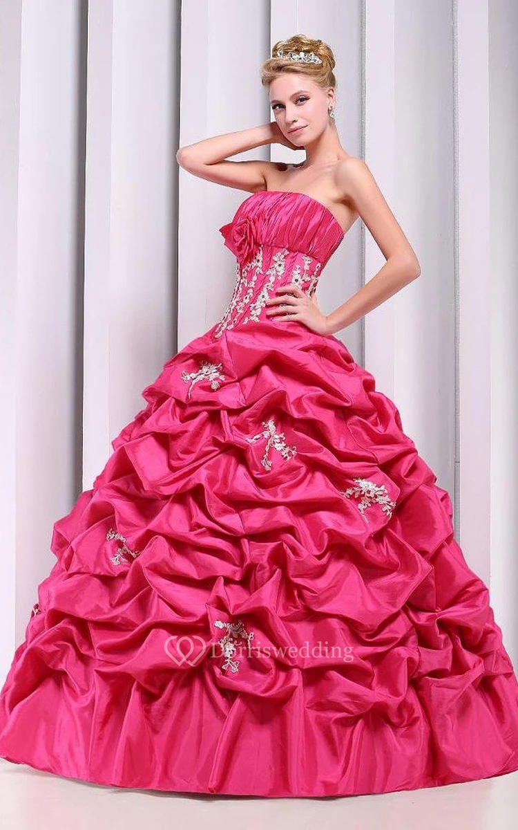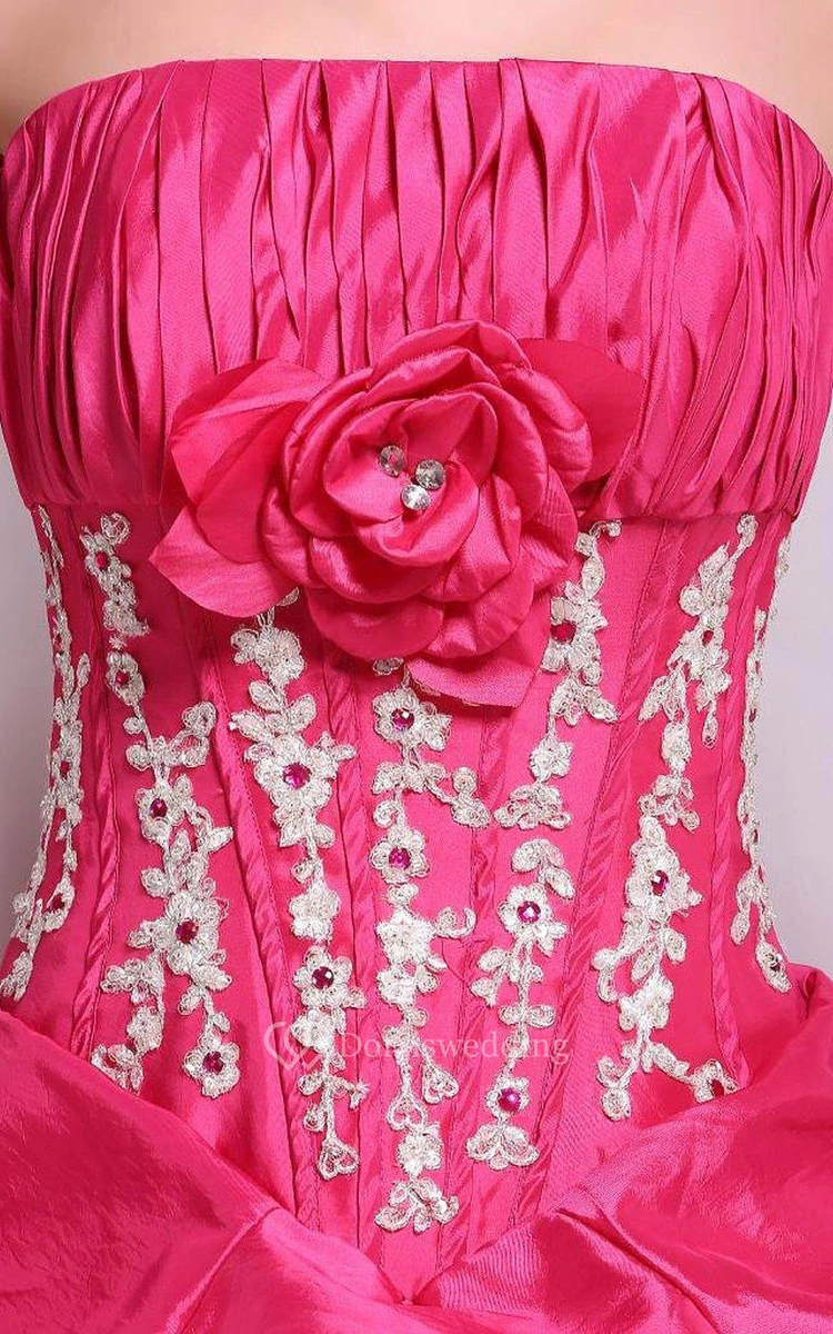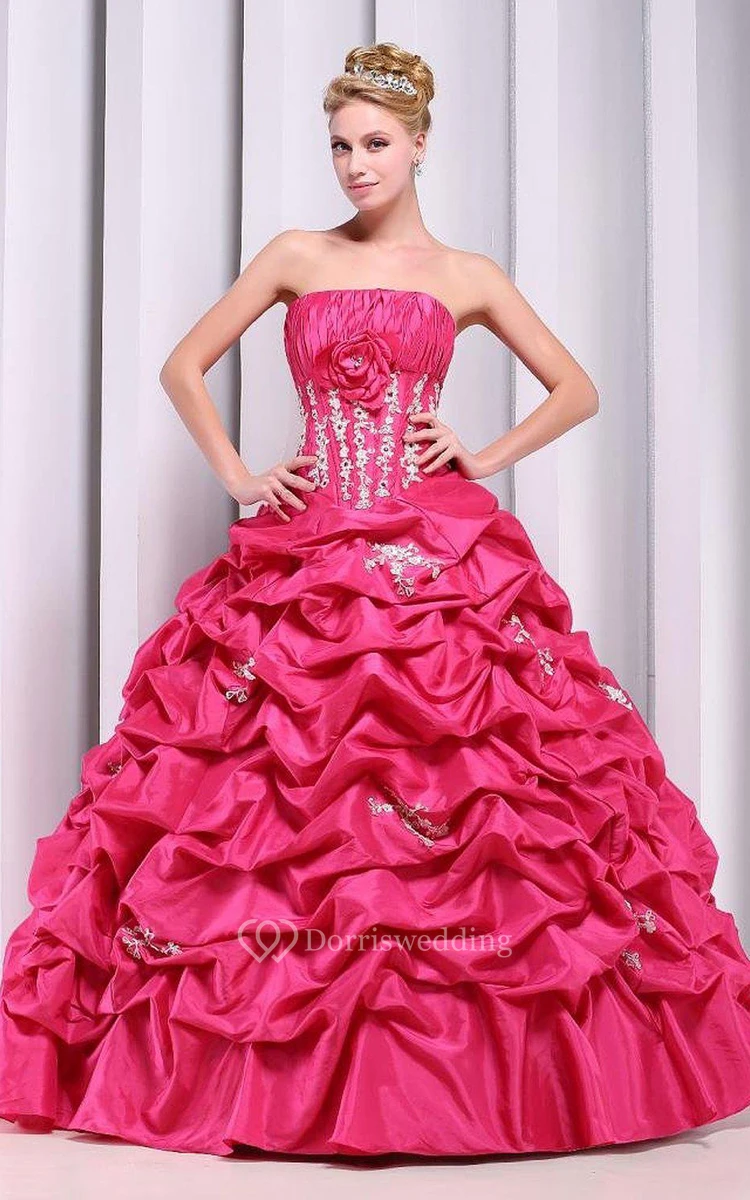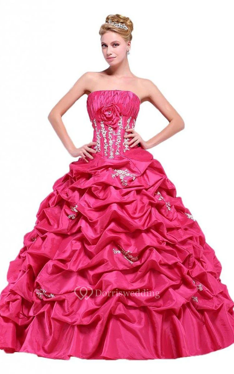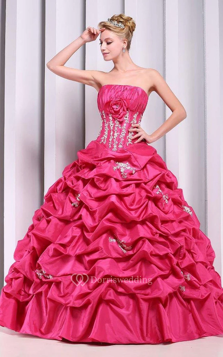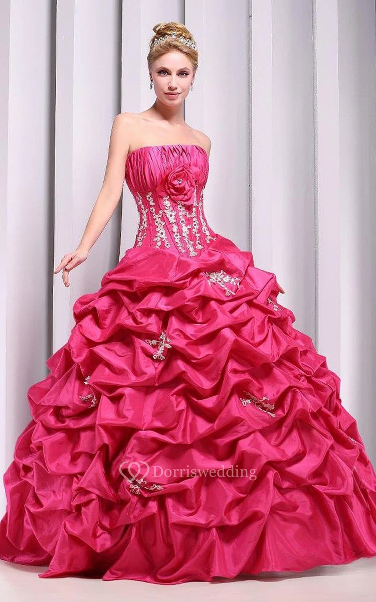 Strapless Ball Gown With Ruffles and Flower Detail