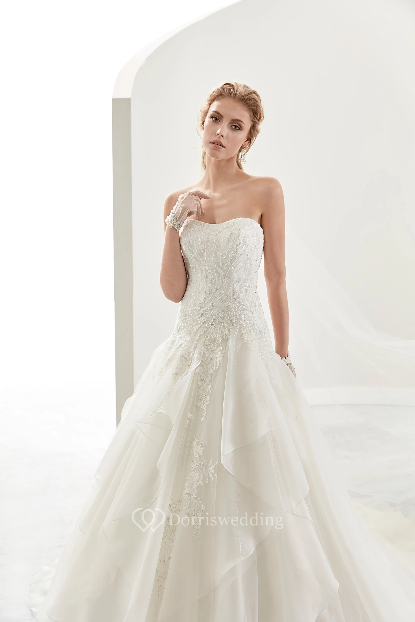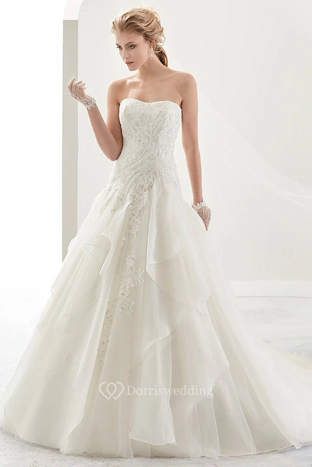 Strapless Beaded A-Line Bridal Gown With Ruffles Overlayer And Court Train