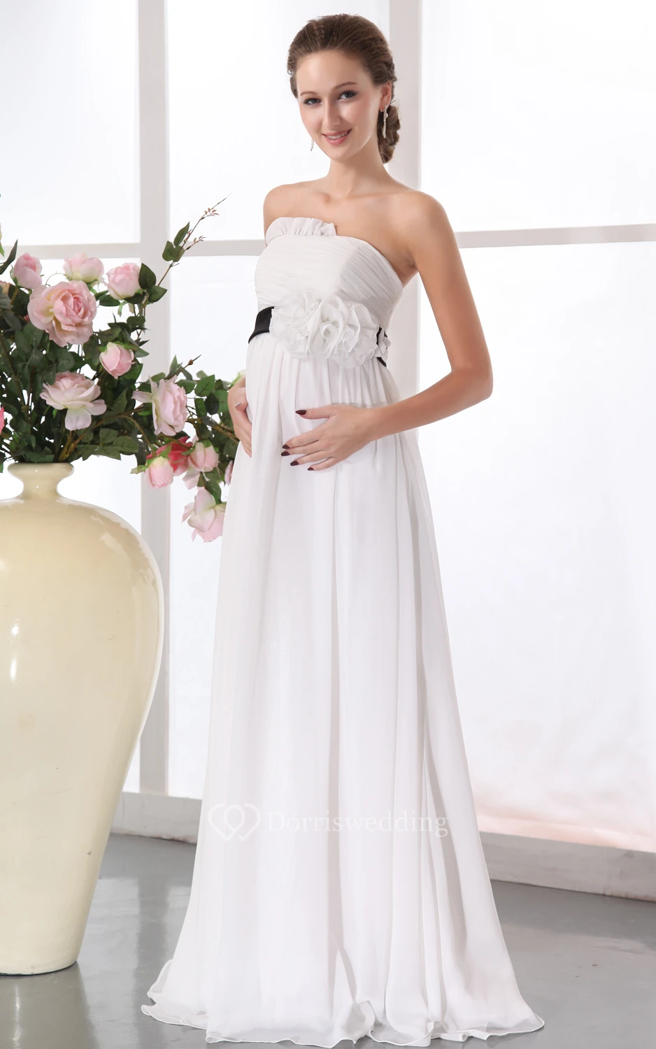 Strapless Chiffon Dress With Floral Waistband