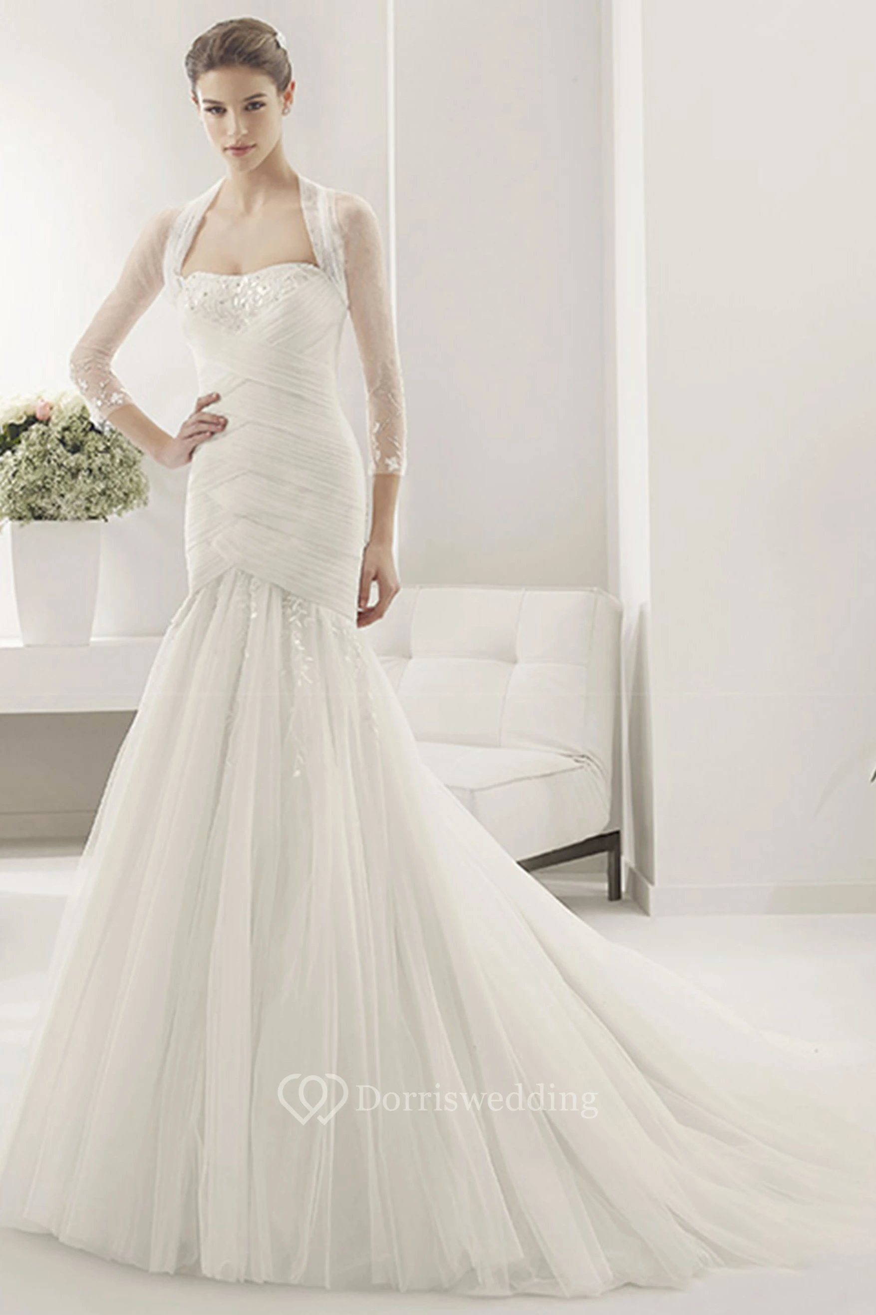 Strapless Criss Cross Top Tulle Mermaid Gown With Removable Tulle Jacket