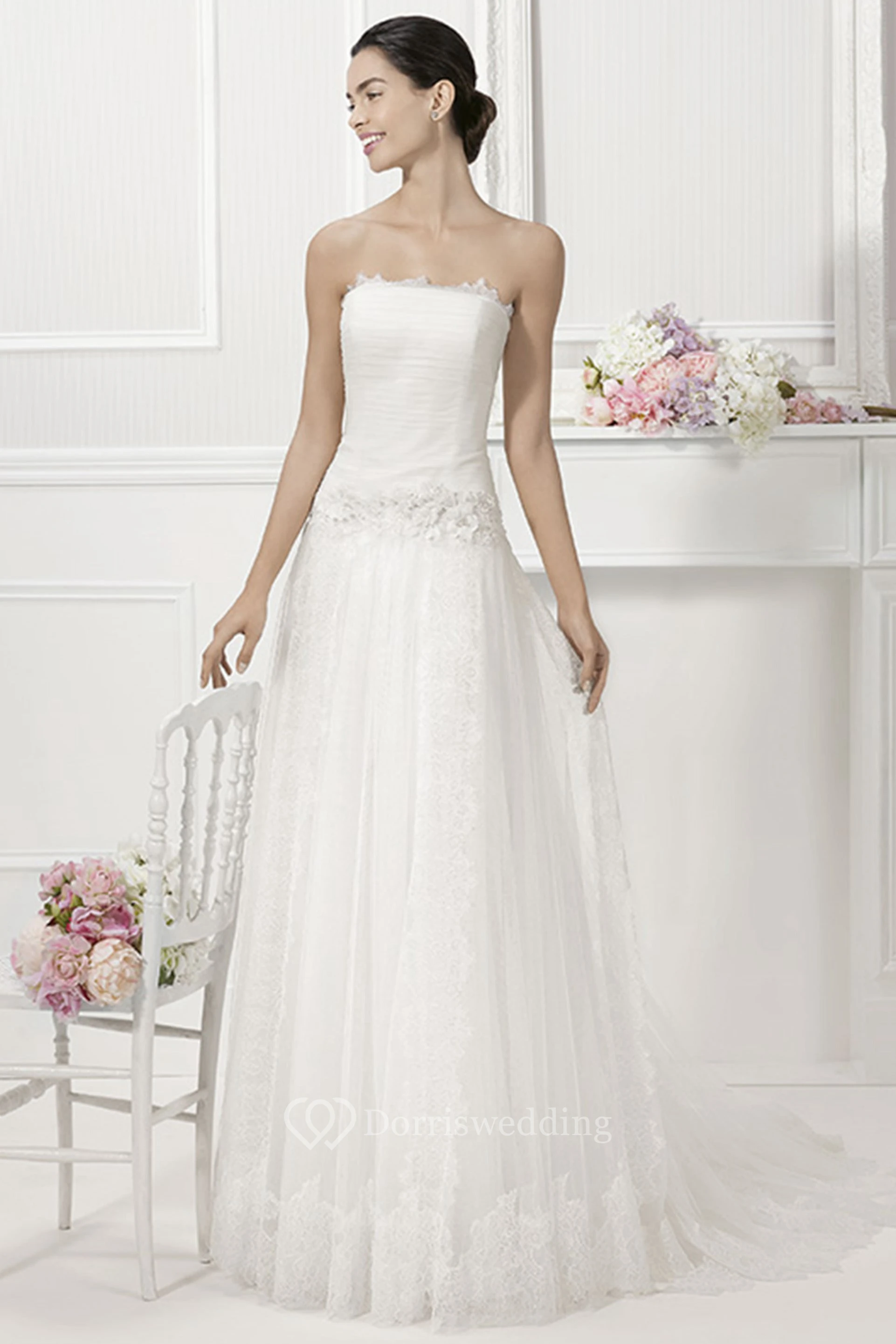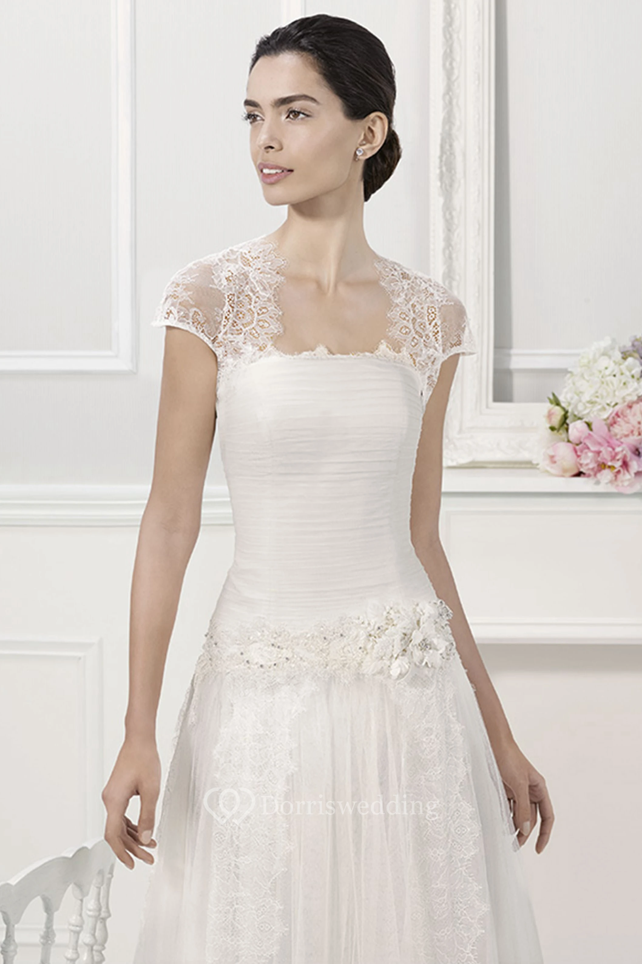 Strapless Drop Waist Tulle Bridal Gown With Removable Lace Cap Sleeves
