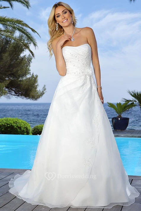 Strapless Floor-Length Appliqued Draped Satin Wedding Dress With Flower And Cape