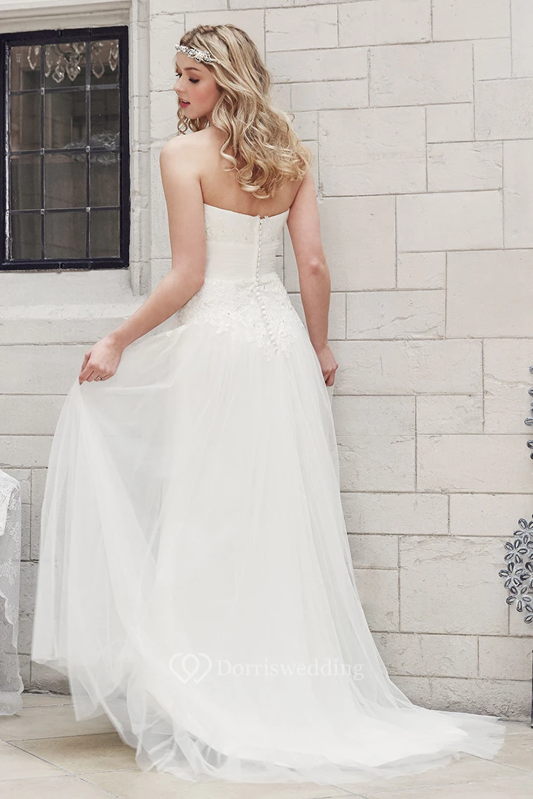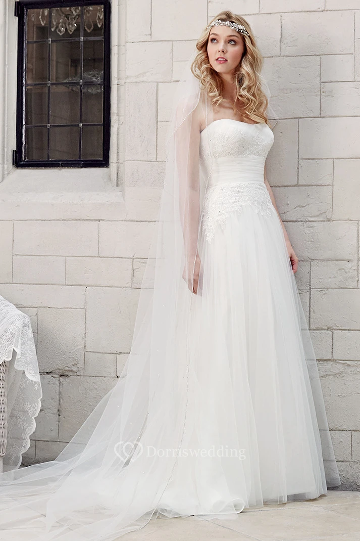 Strapless Floor-Length Appliqued Tulle Wedding Dress With Court Train