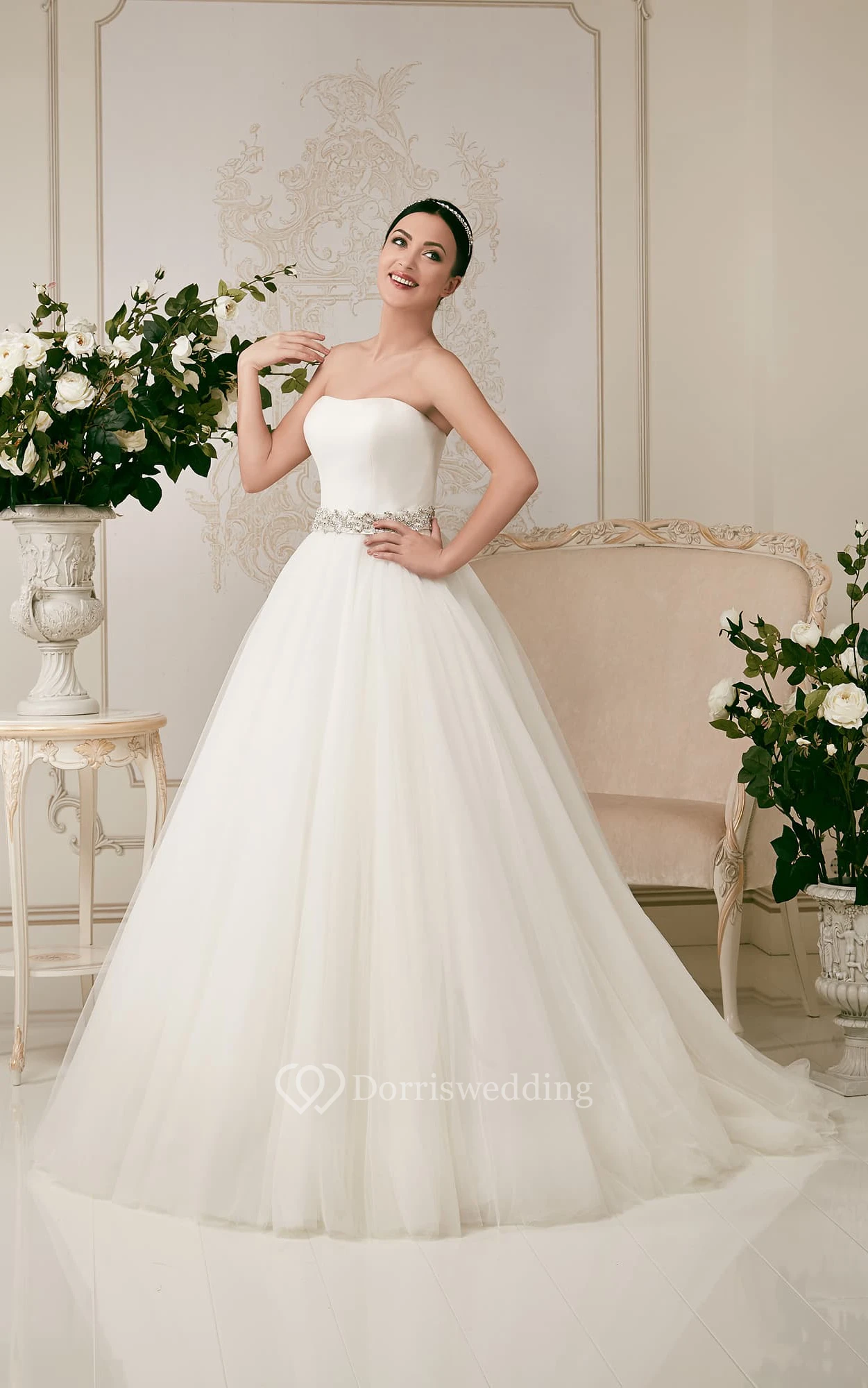 Strapless Floor-length Ball Gown Crystal Decorated Waist Tulle Dress