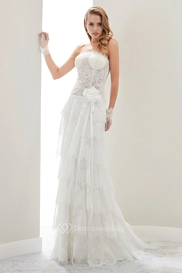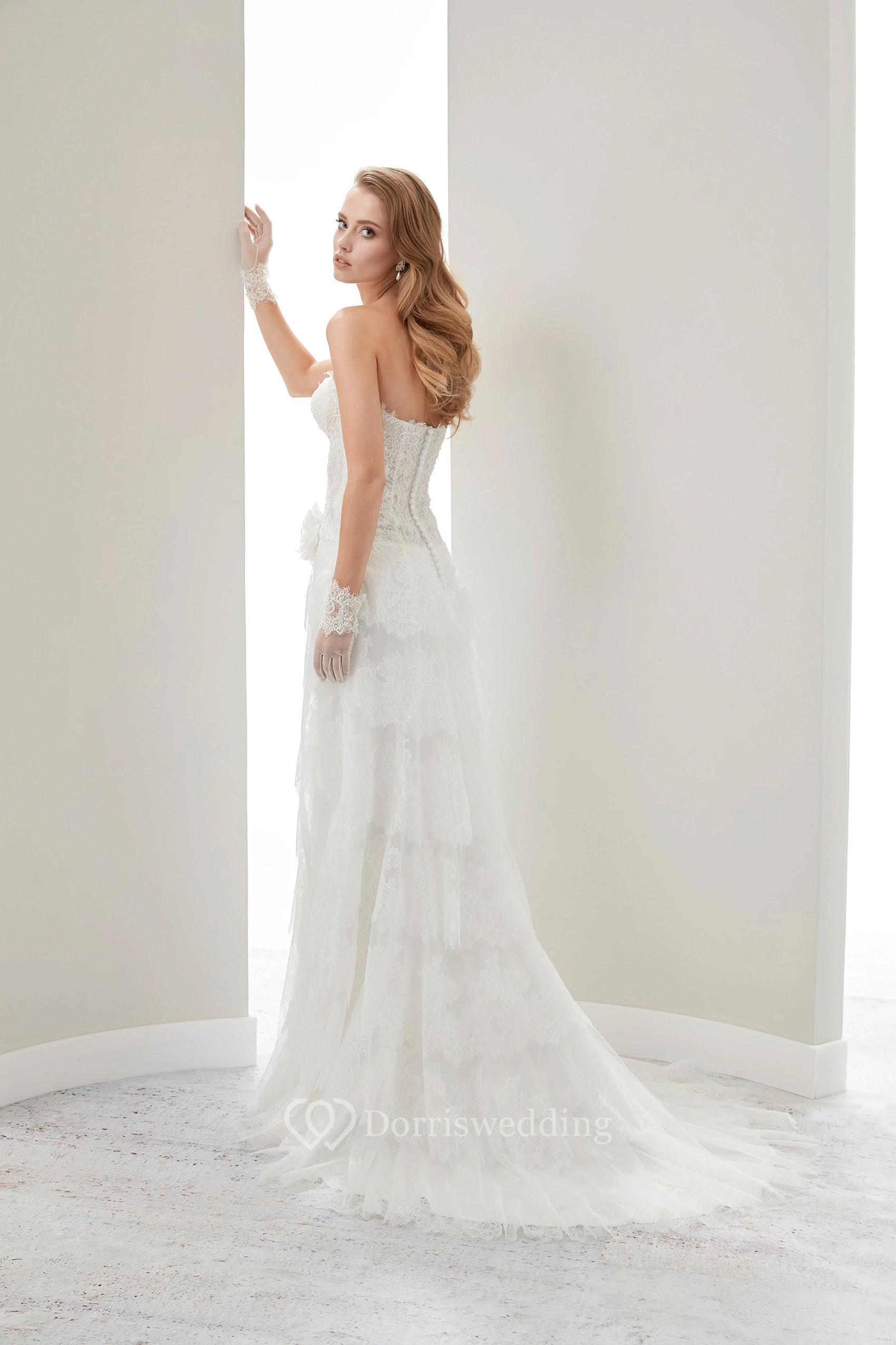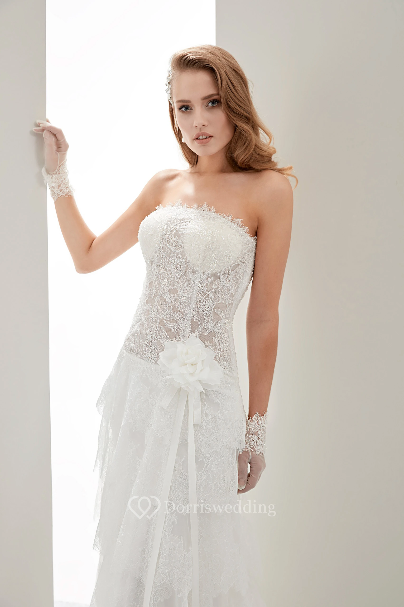 Strapless Flower Draping Wedding Gown with Lace Corset and Side-split Overlayer