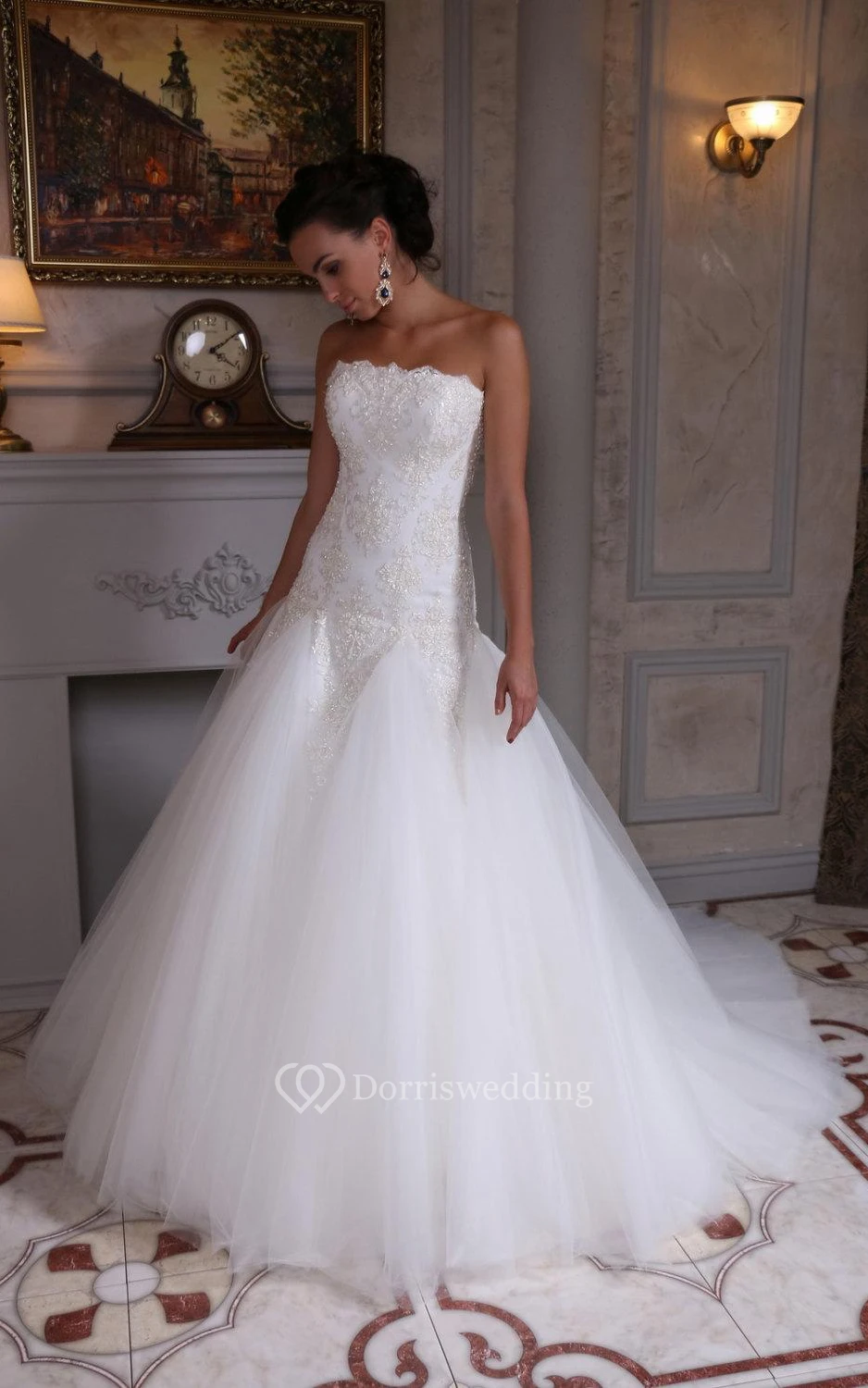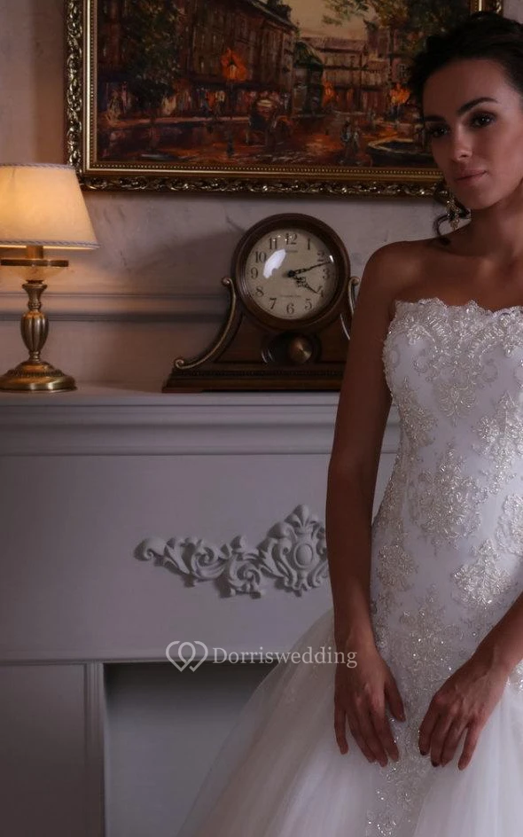 Strapless Lace and Tulle Dress With Dropped Waistline and Beadings