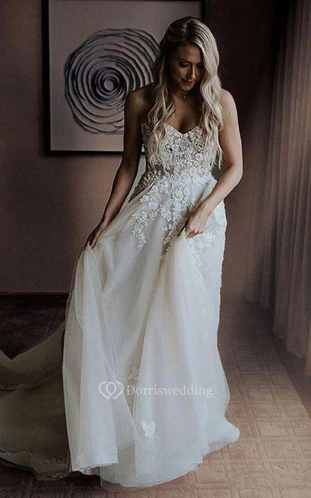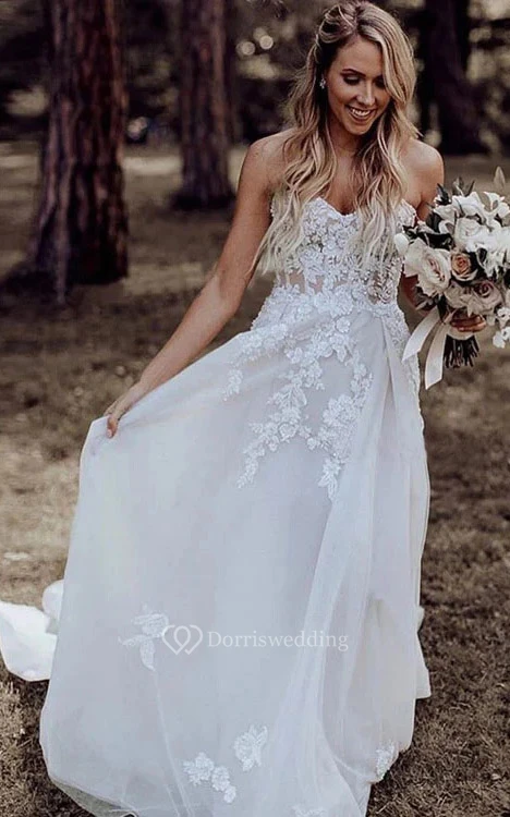 Strapless Lace Applique Sheath Simple Elegant Wedding Dress
