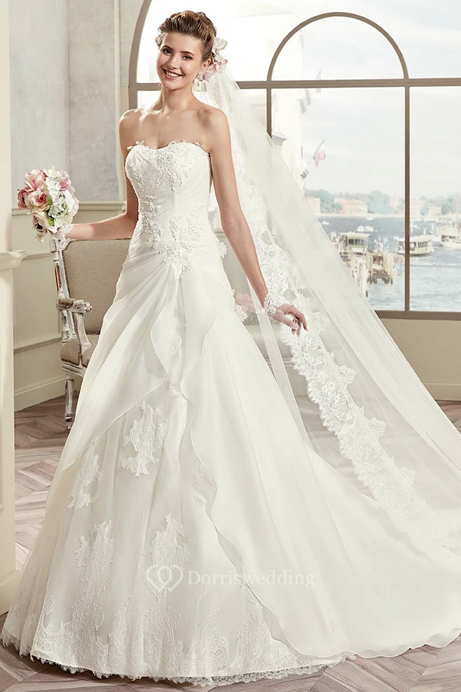 Strapless Lace Long Wedding Dress With Asymmetrical Ruffles And Lace-Up Back