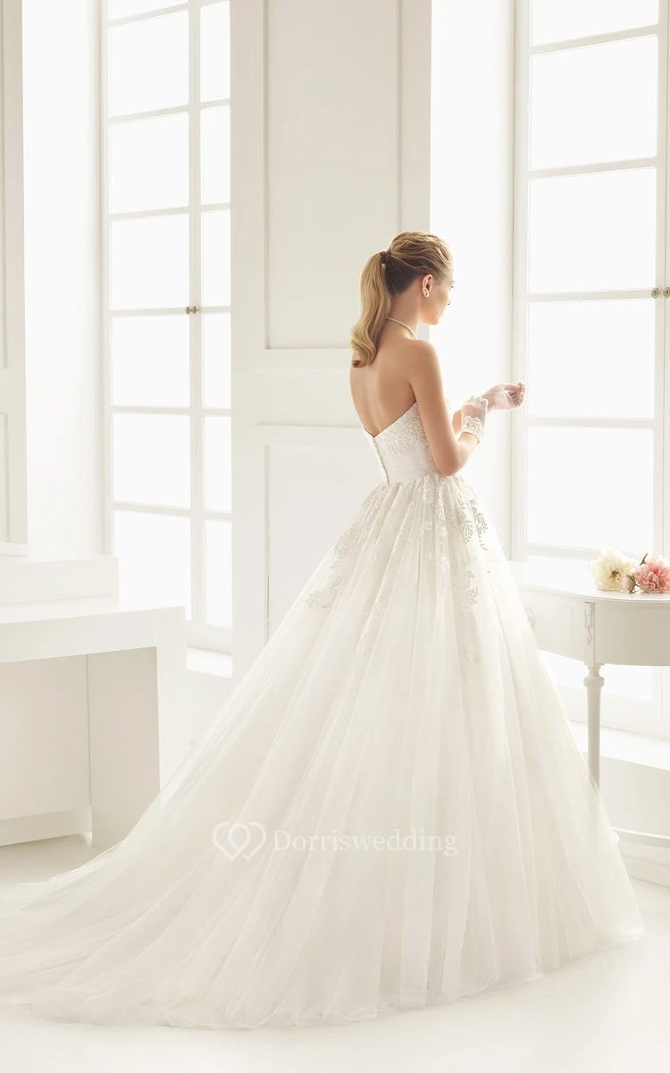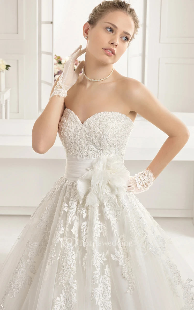 Strapless Lacy Bodice Gown With Tulle Flora Waistband