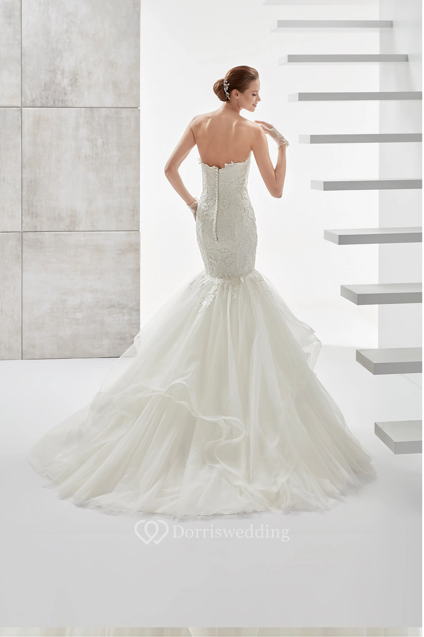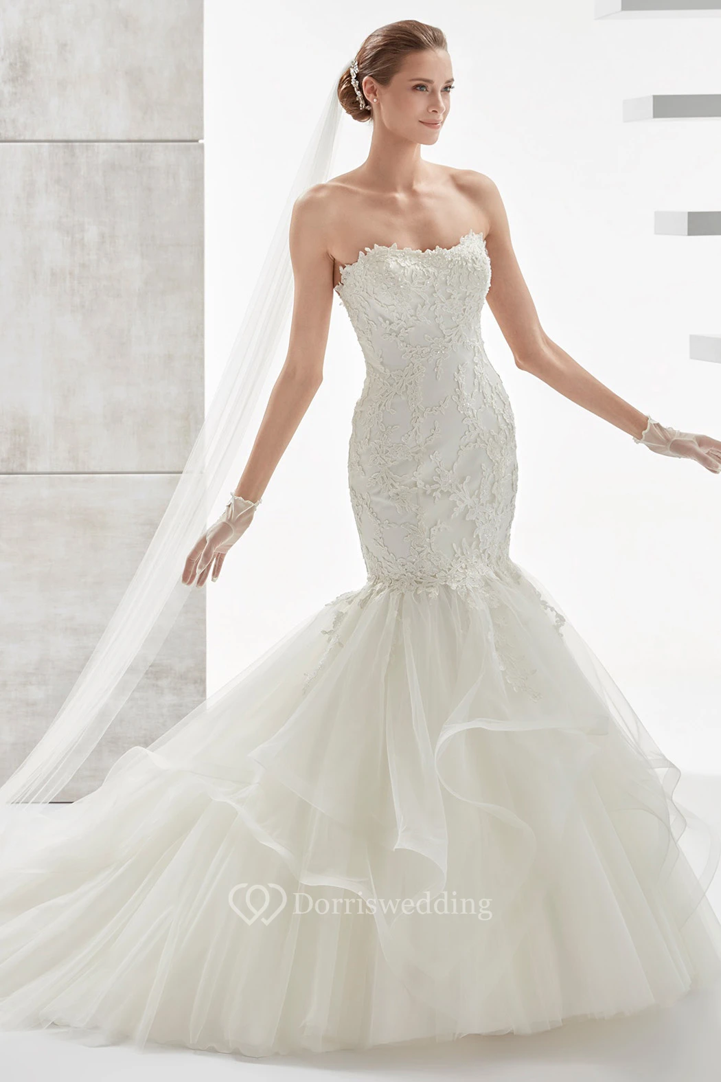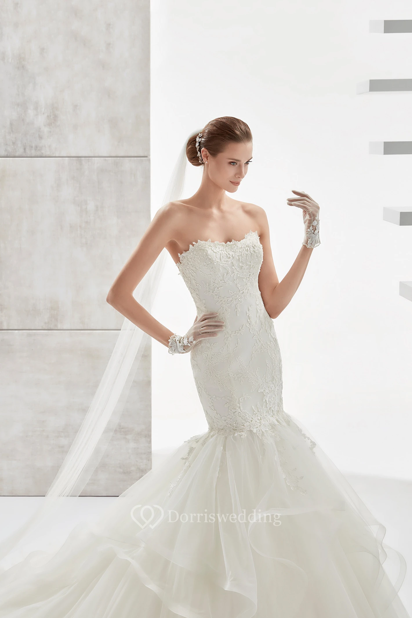 Strapless Mermaid Lace Wedding Dress with Ruffled Train and Appliques