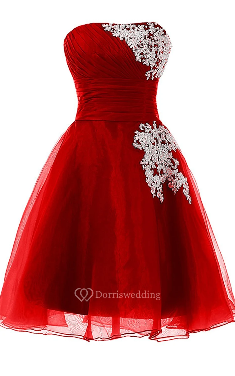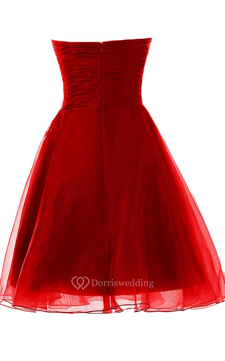 Strapless Pleated Dress With Ruching and Tulle Overlay