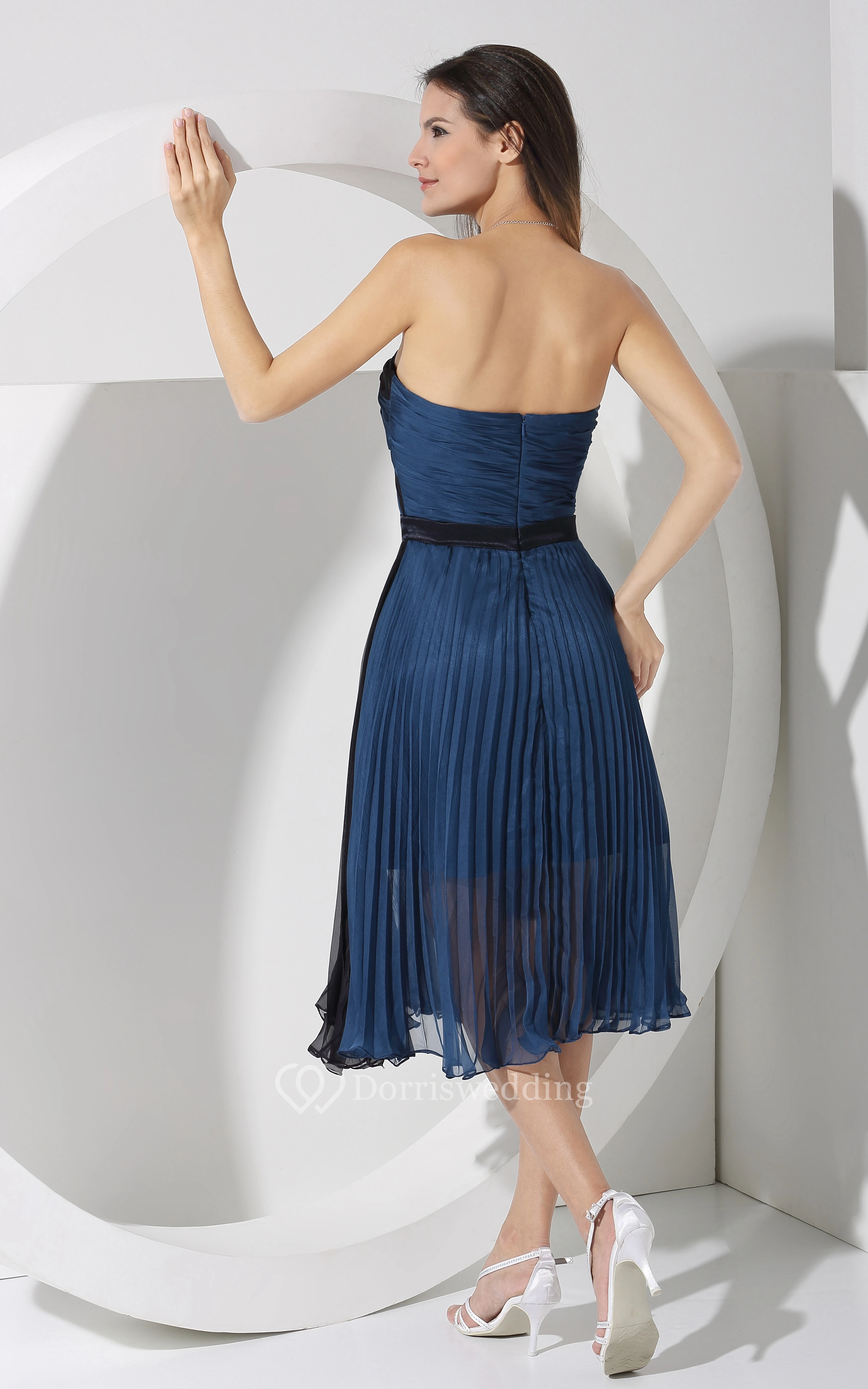 Strapless Pleated Tea-Length Dress With Blend Color Design