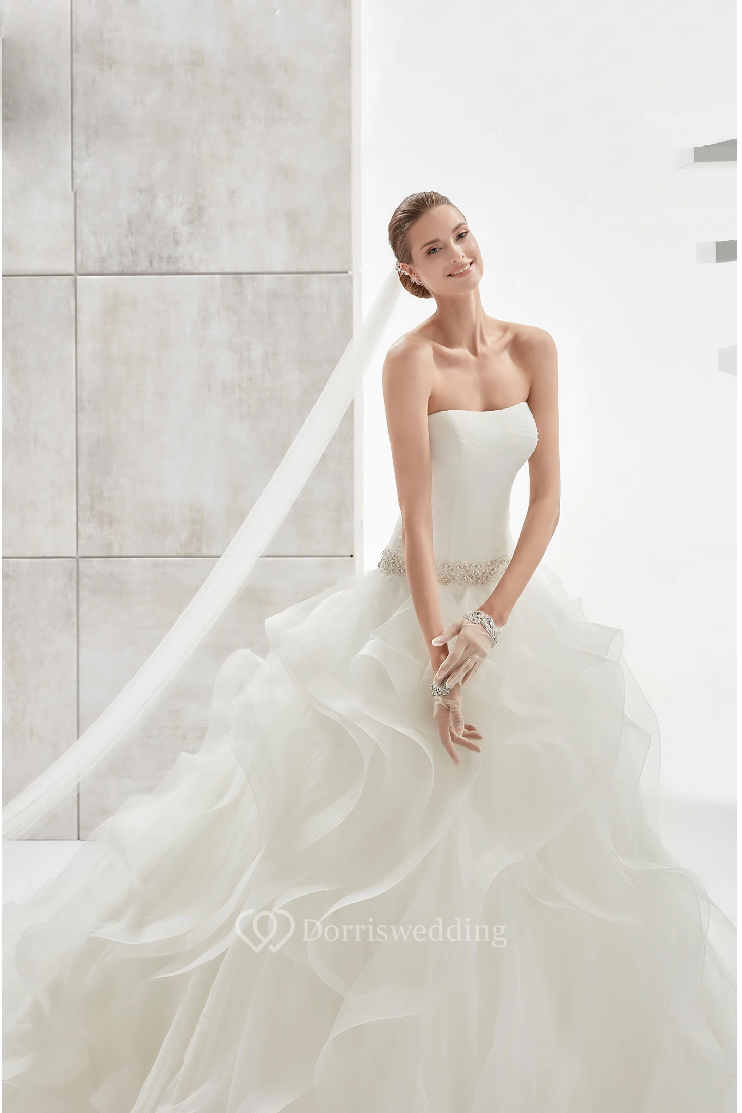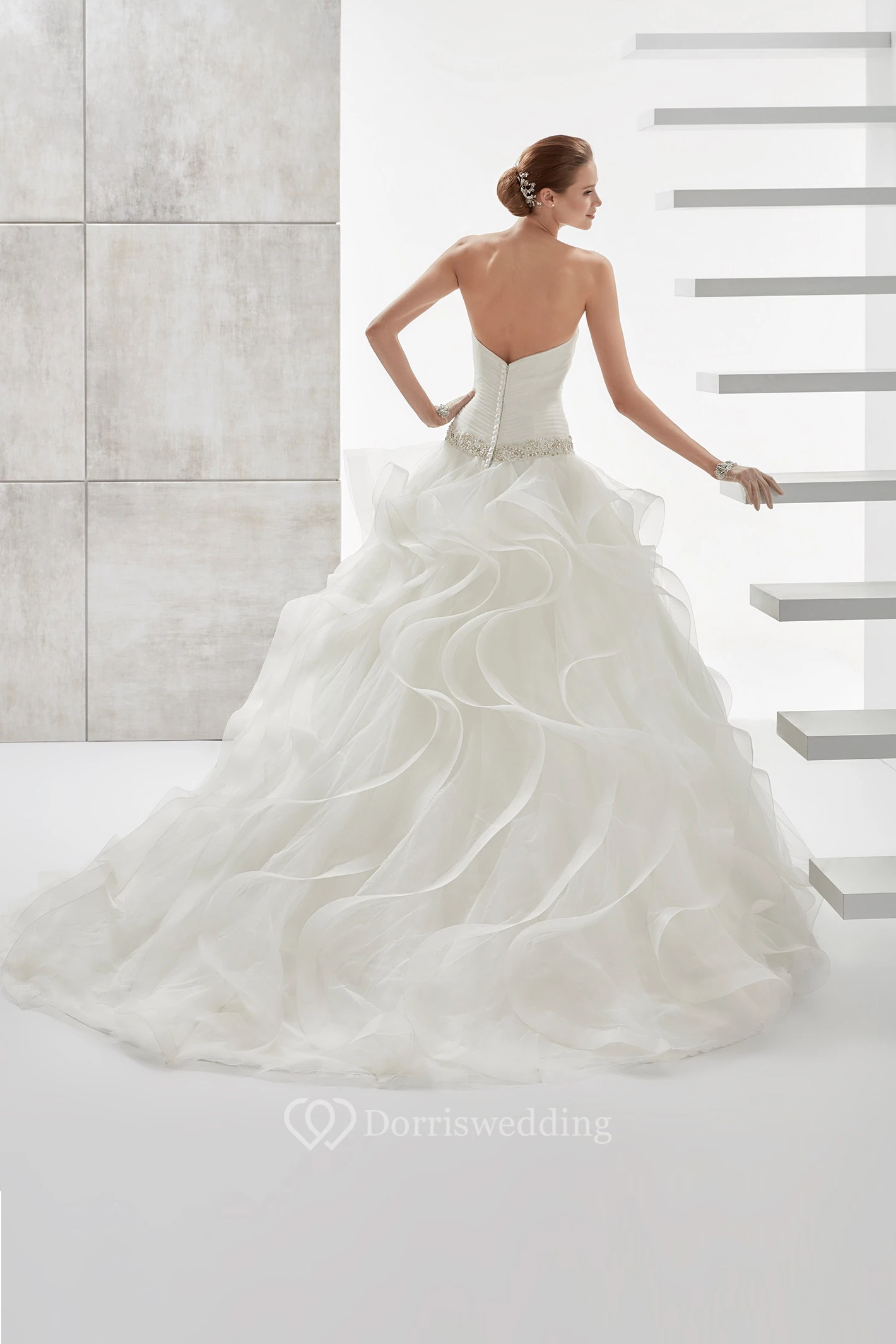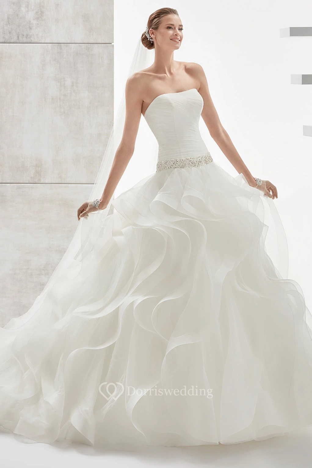 Strapless Pleating Wedding Dress with Cascading Ruffles and Beaded Details