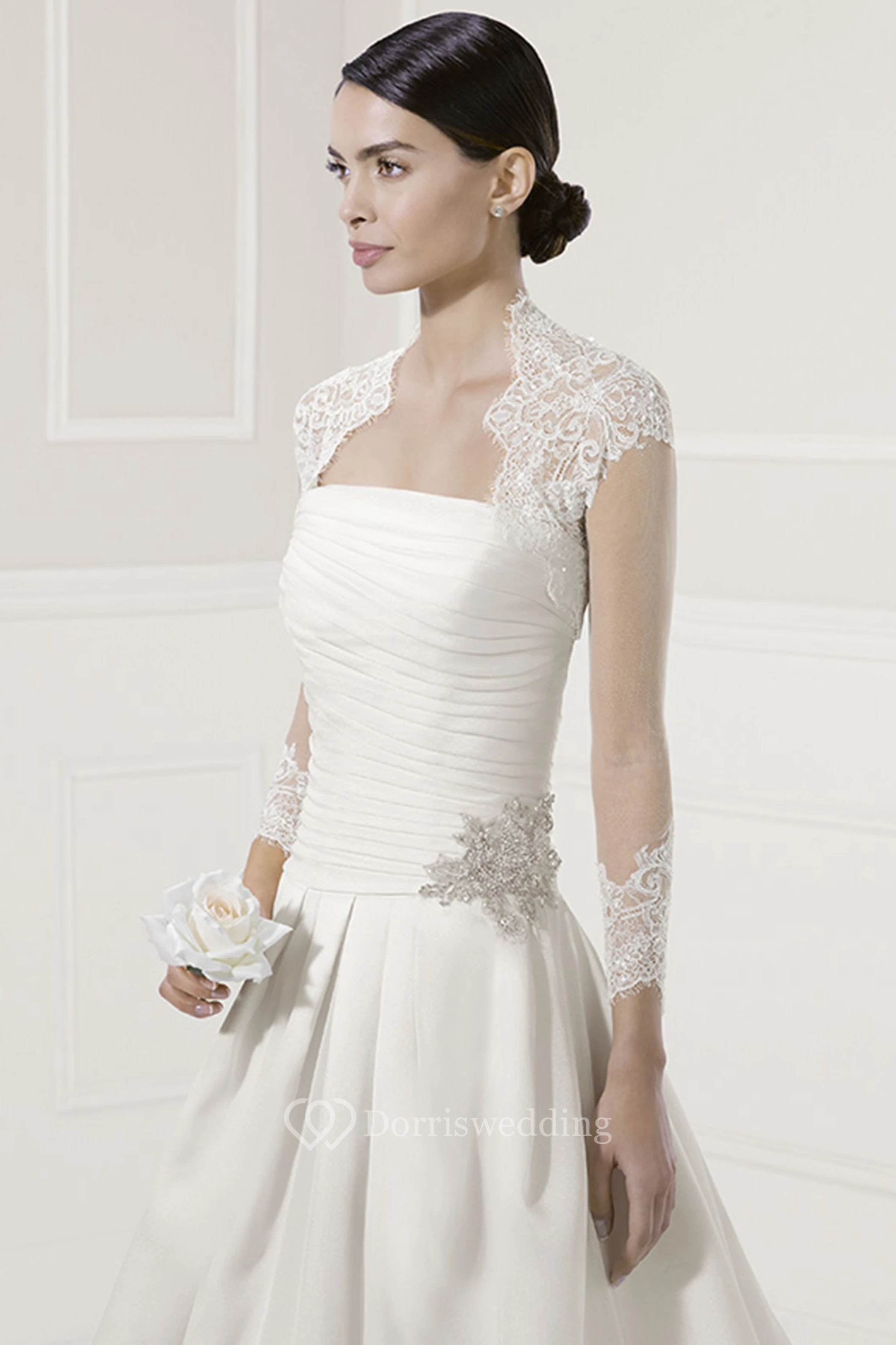 Strapless Ruched A-Line Bridal Gown With Removable Long-Sleeve Lace Jacket