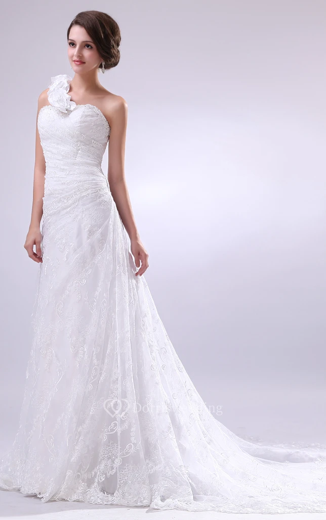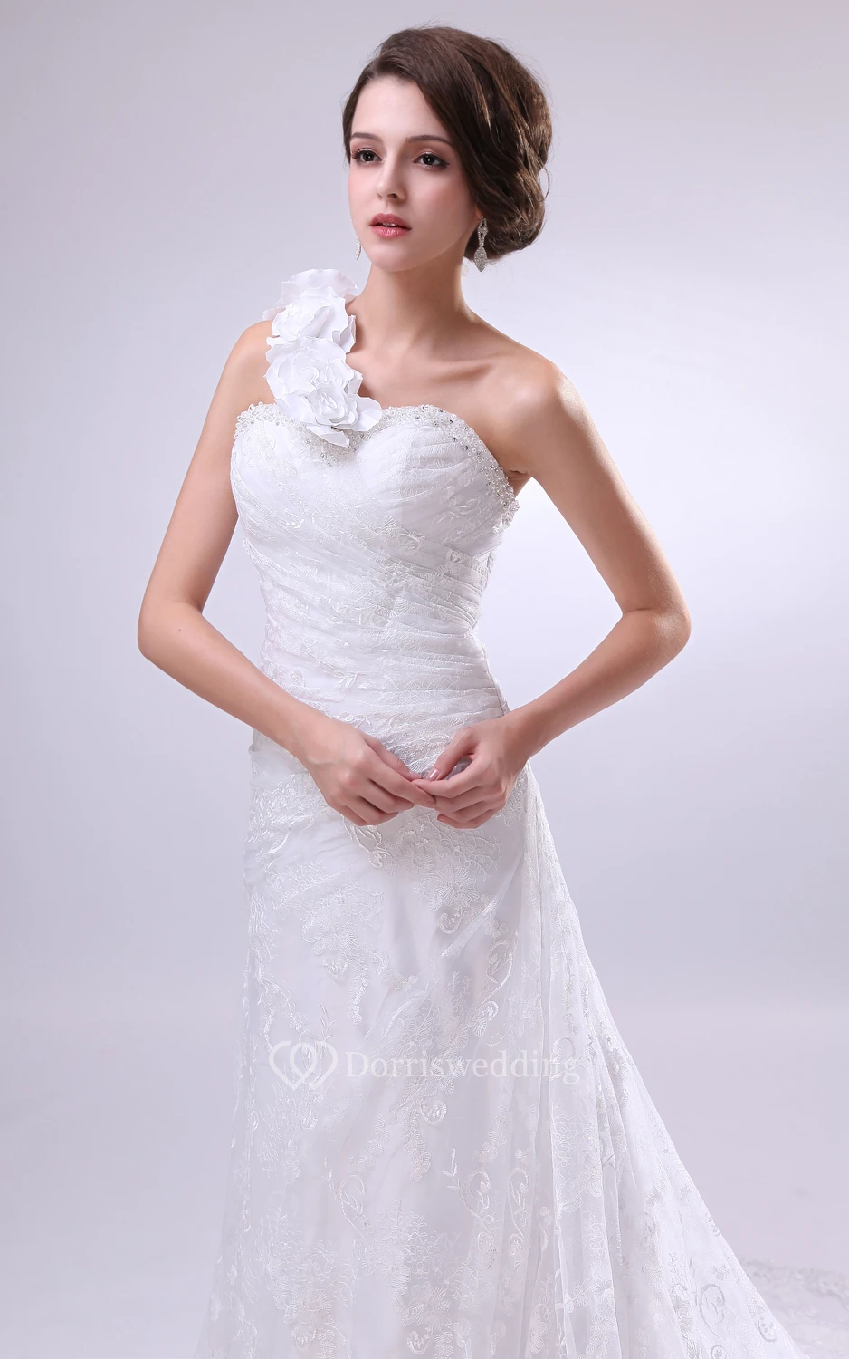 Strapless Ruched Dress With Single Floral Strap and Tulle Overlay
