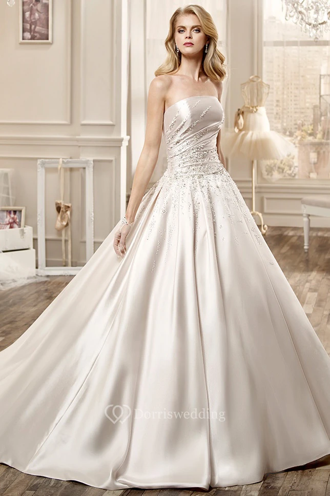 Strapless Satin Long Wedding Dress With Beading Embellishment And Chapel Train