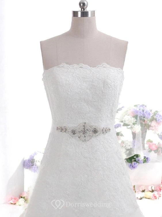 Strapless Scalloped Neckline A-Line Lace Dress With Beaded Sash