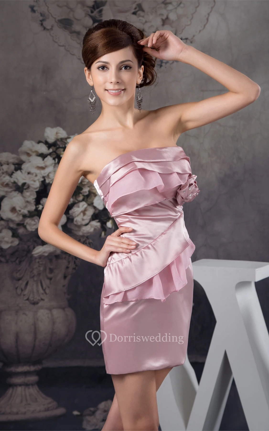 Strapless Short Satin Draping and Dress With Flower