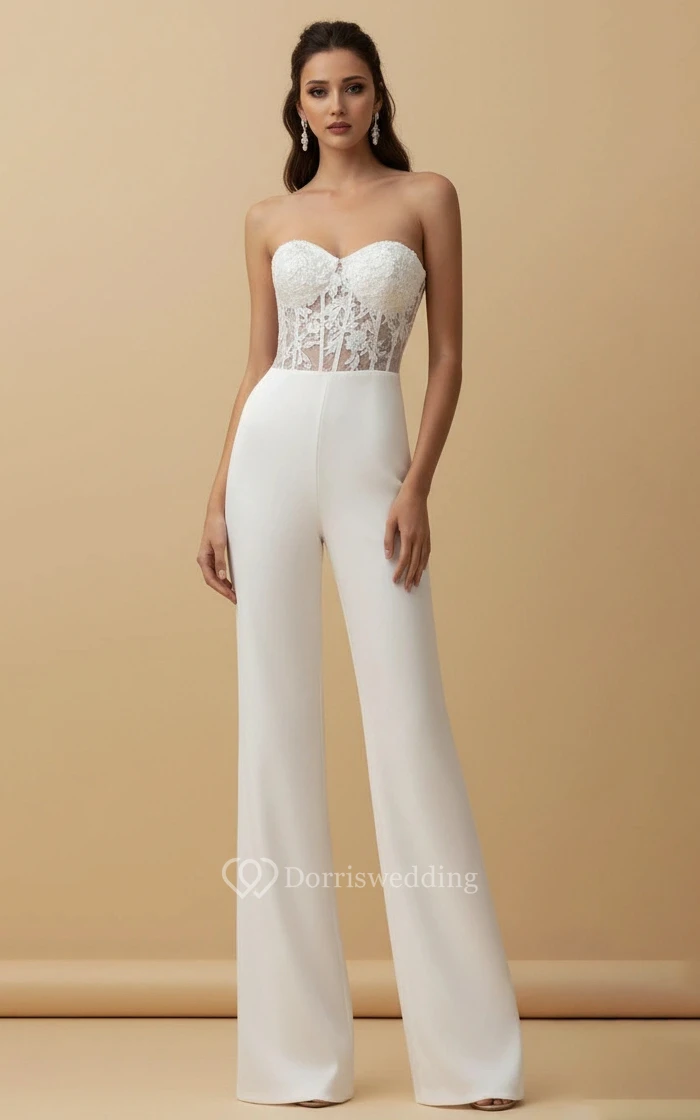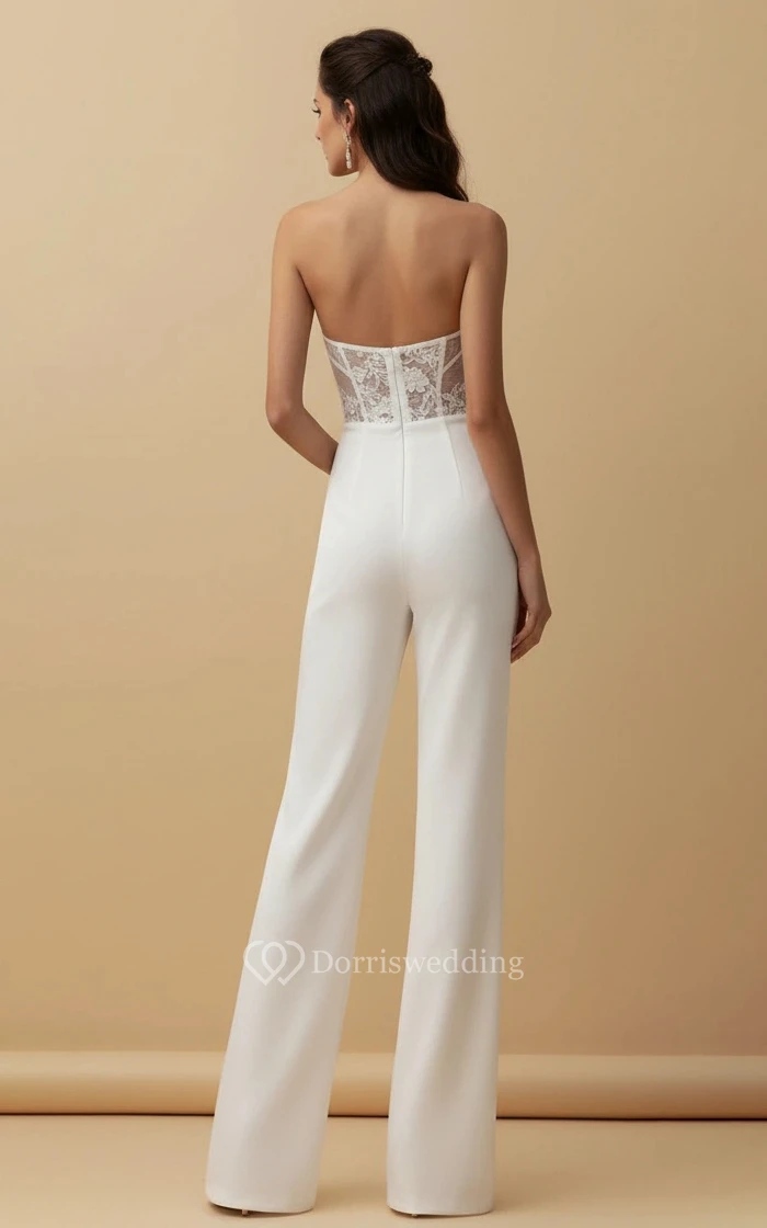 This jumpsuit is the ultimate in bridal versatility. The lace corset is so pretty and the strapless sweetheart neck is very flattering. The satin overskirt is the perfect addition for a dramatic ceremony entrance. I felt so beautiful and comfortable all day long. The quality is excellent and it fits true to size.