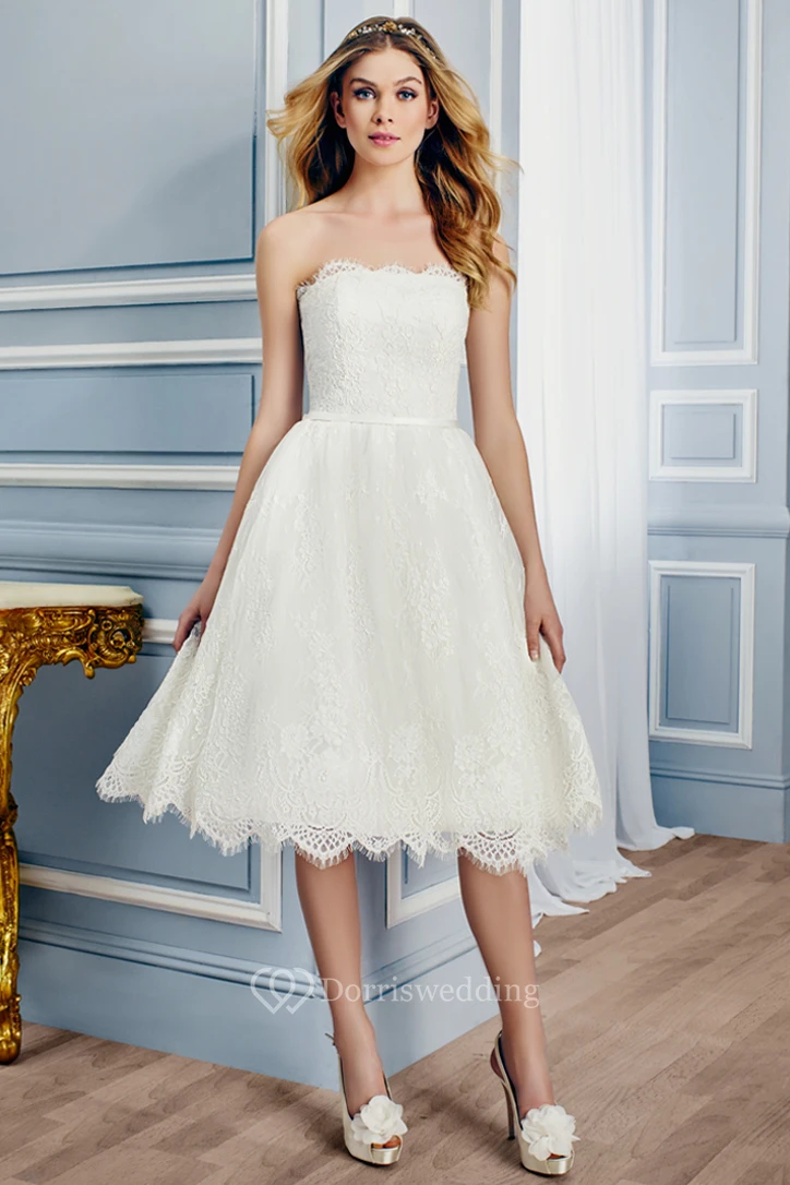 Strapless Tea-Length Lace Wedding Dress With V Back