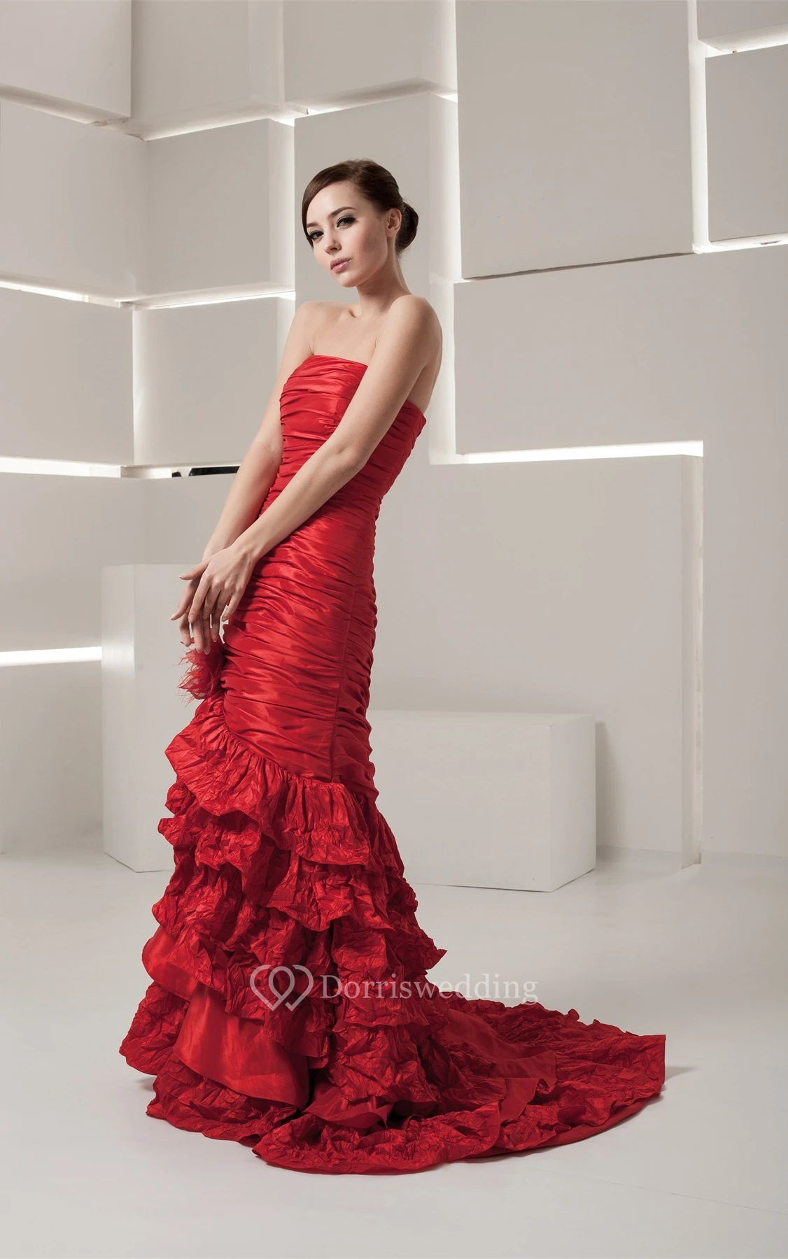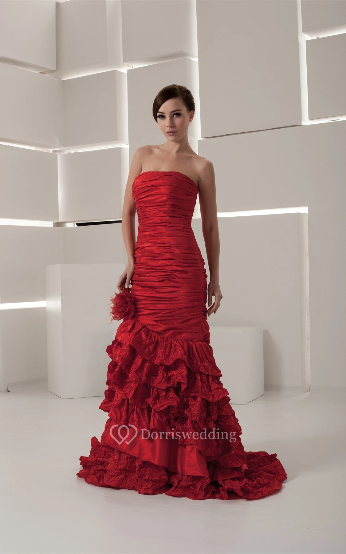 Strapless Tiered Column Ruched Bodice and Dress With Flower