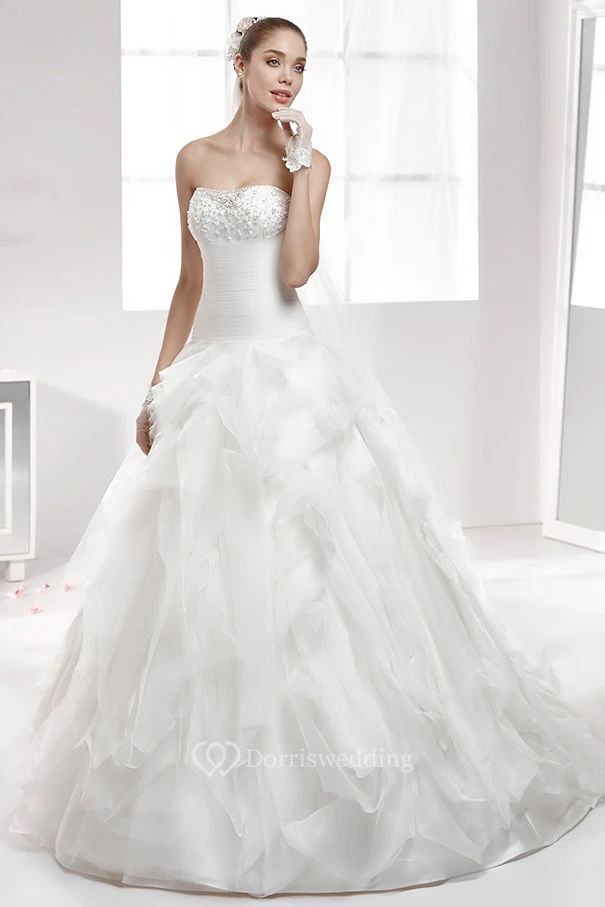 Strapless Wedding Gown With Ruffled Skirt and Beaded Bust