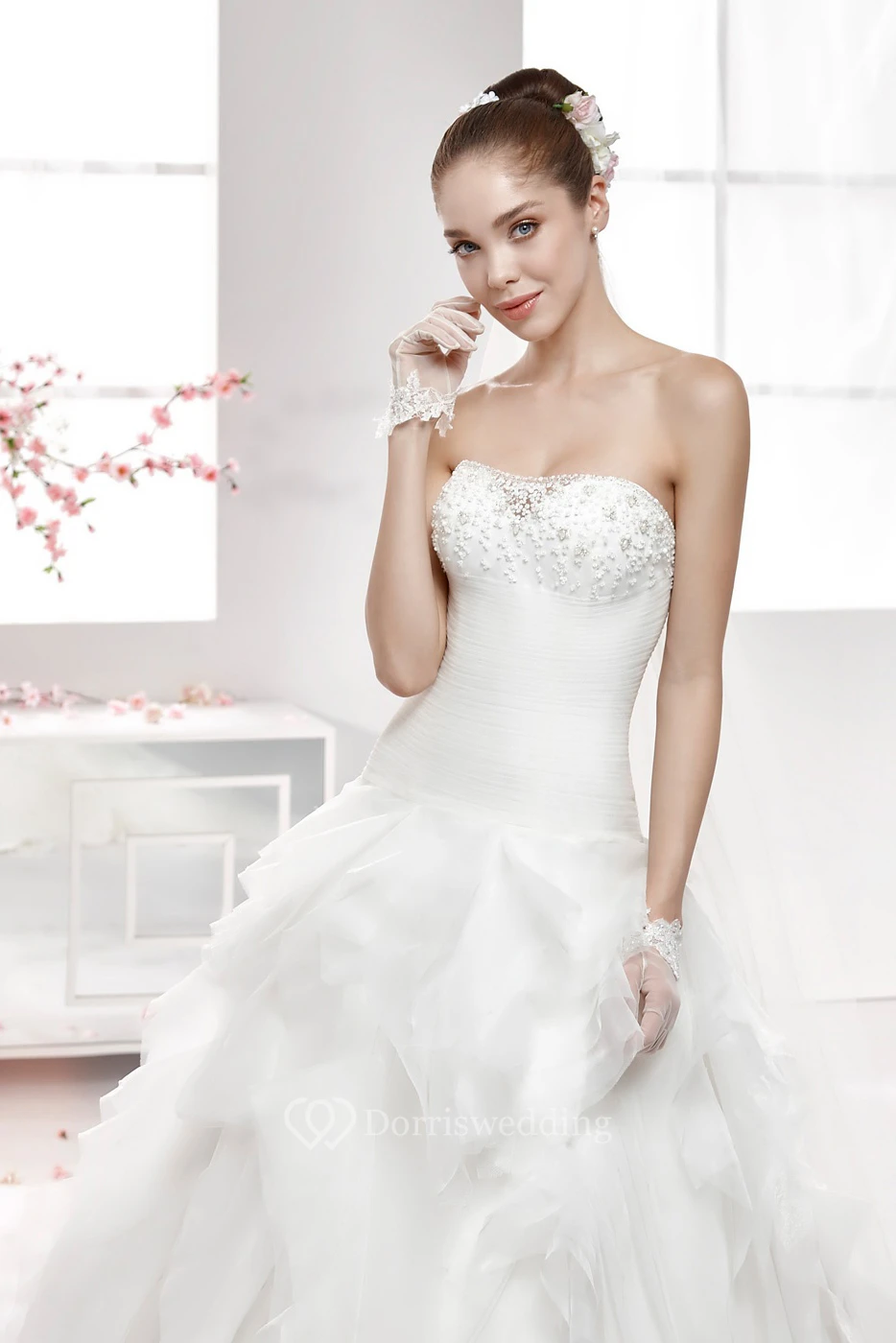 • Embellishments: Beading, Cascading Ruffles, Ruching