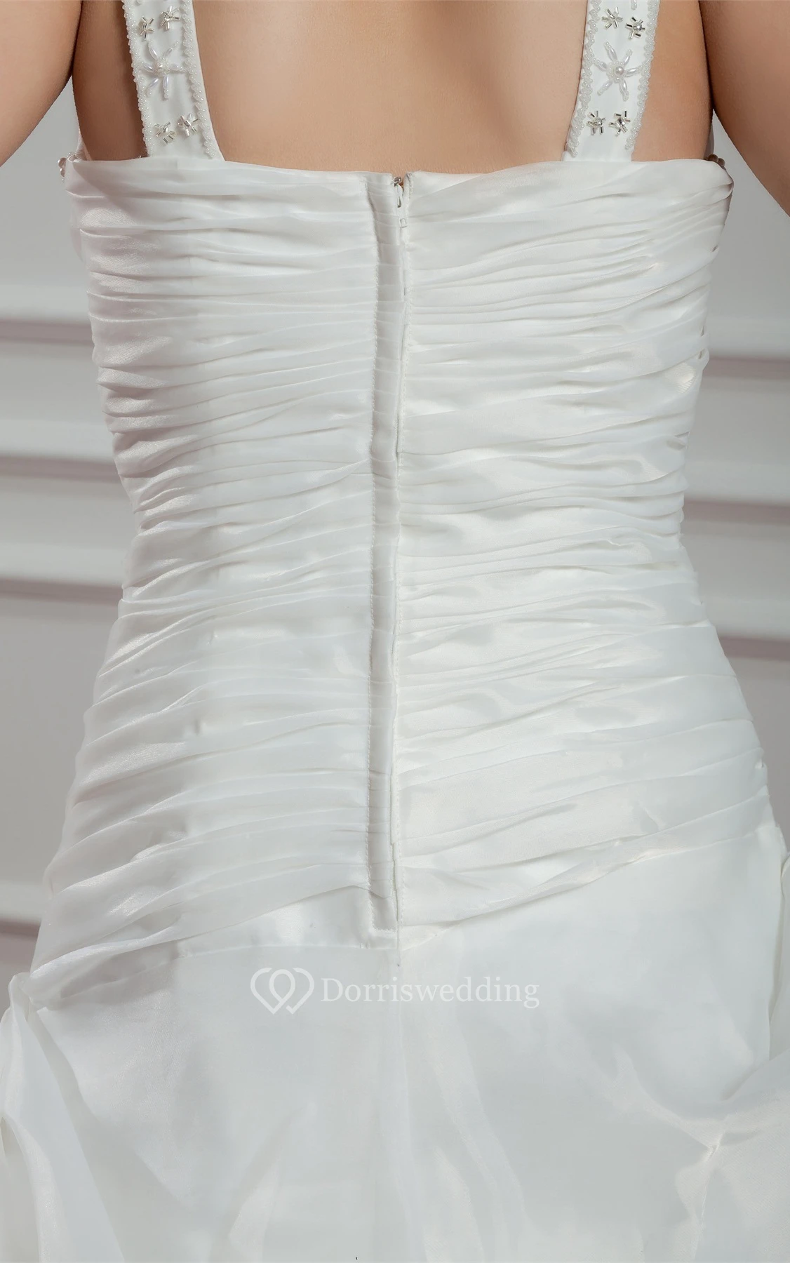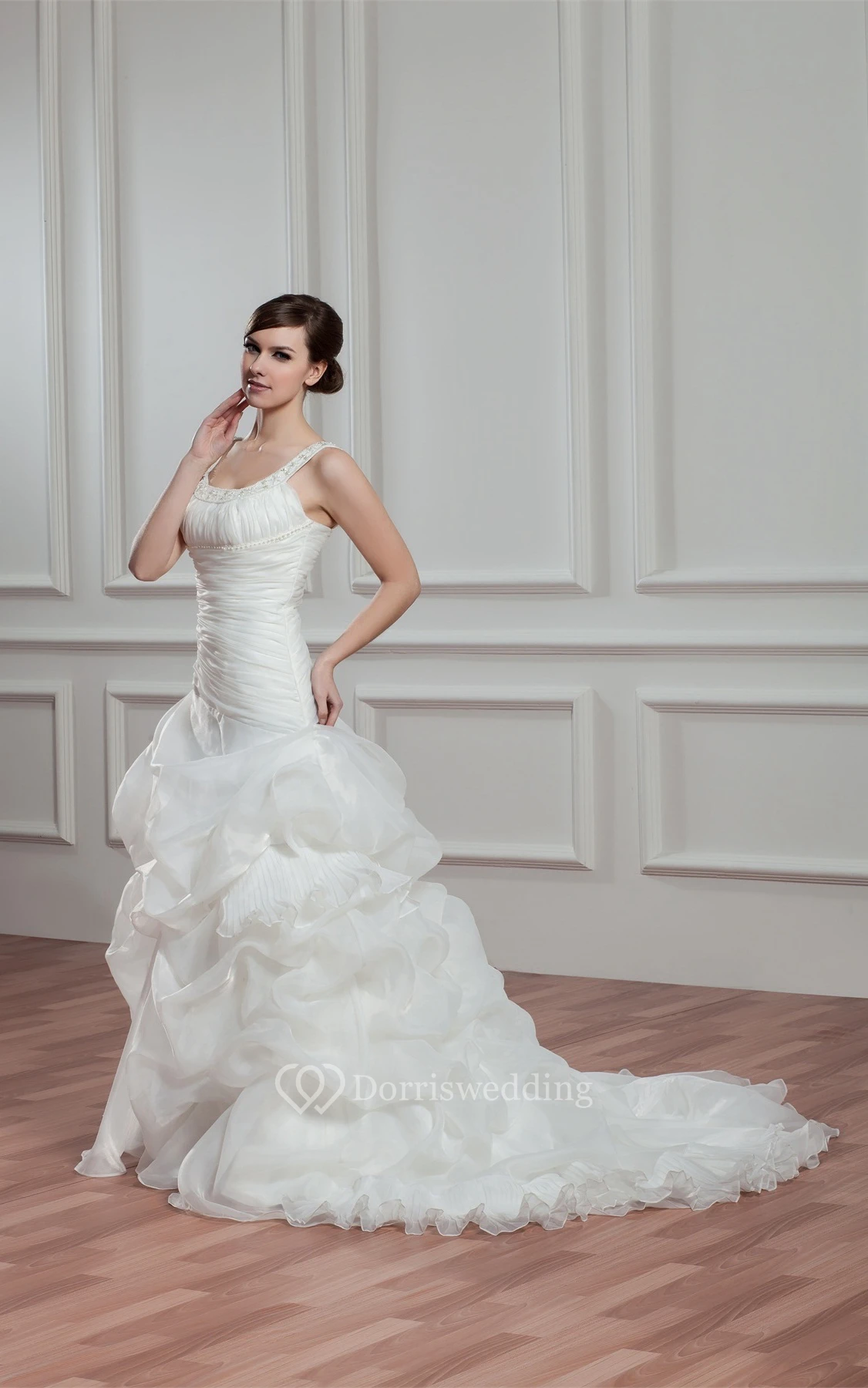 Strapped A-Line Pick-Up Ruched Bodice and Gown With Beading