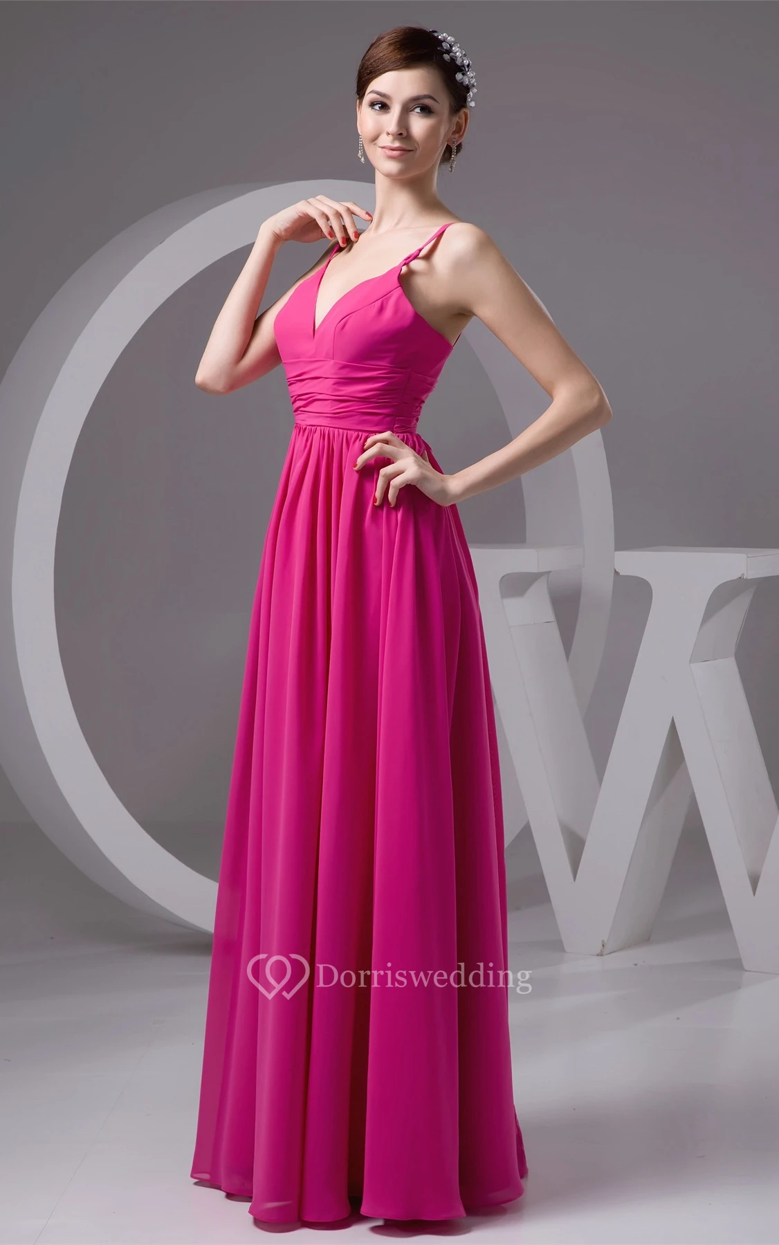 Strapped Chiffon Floor-Length Plunged Gown With Pleats