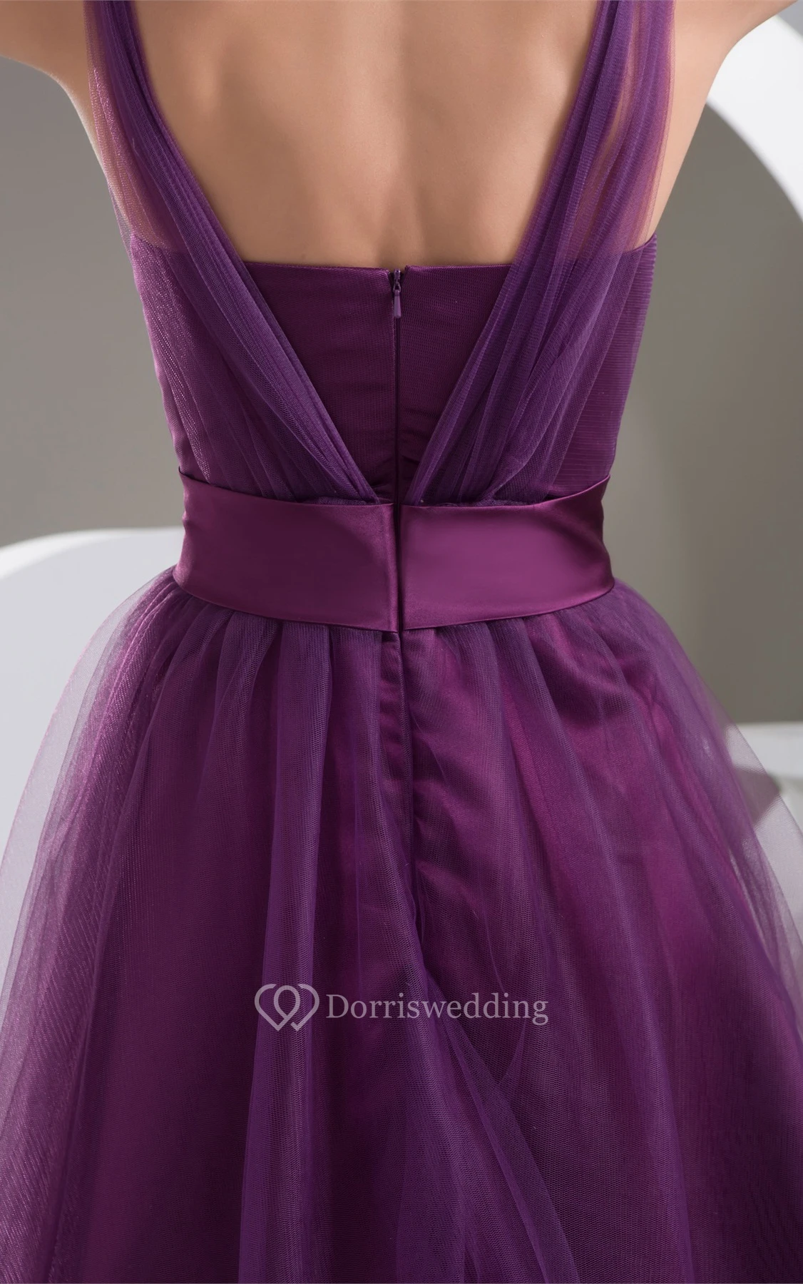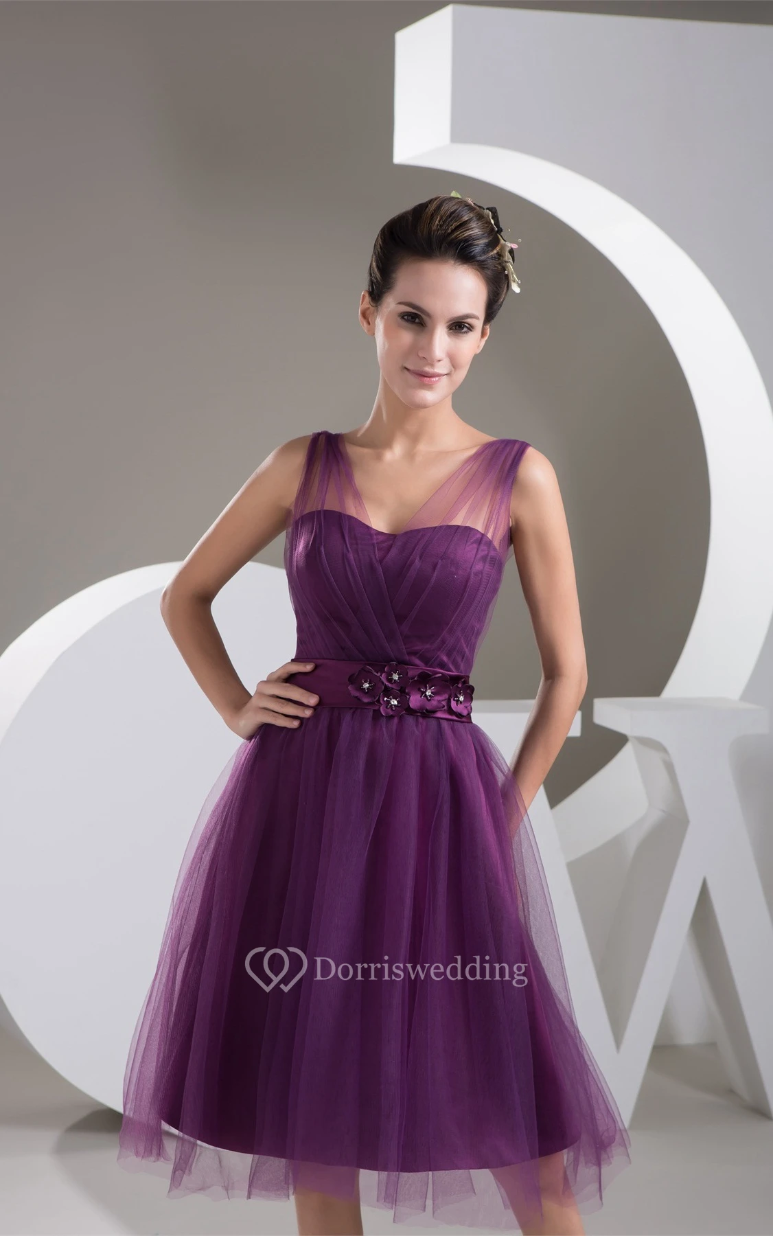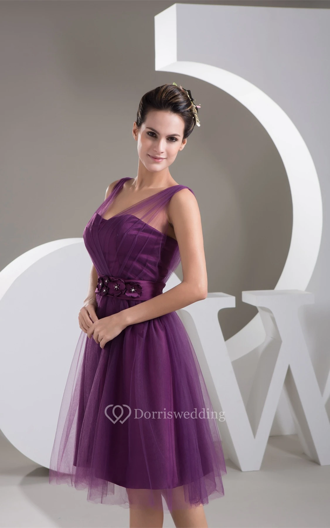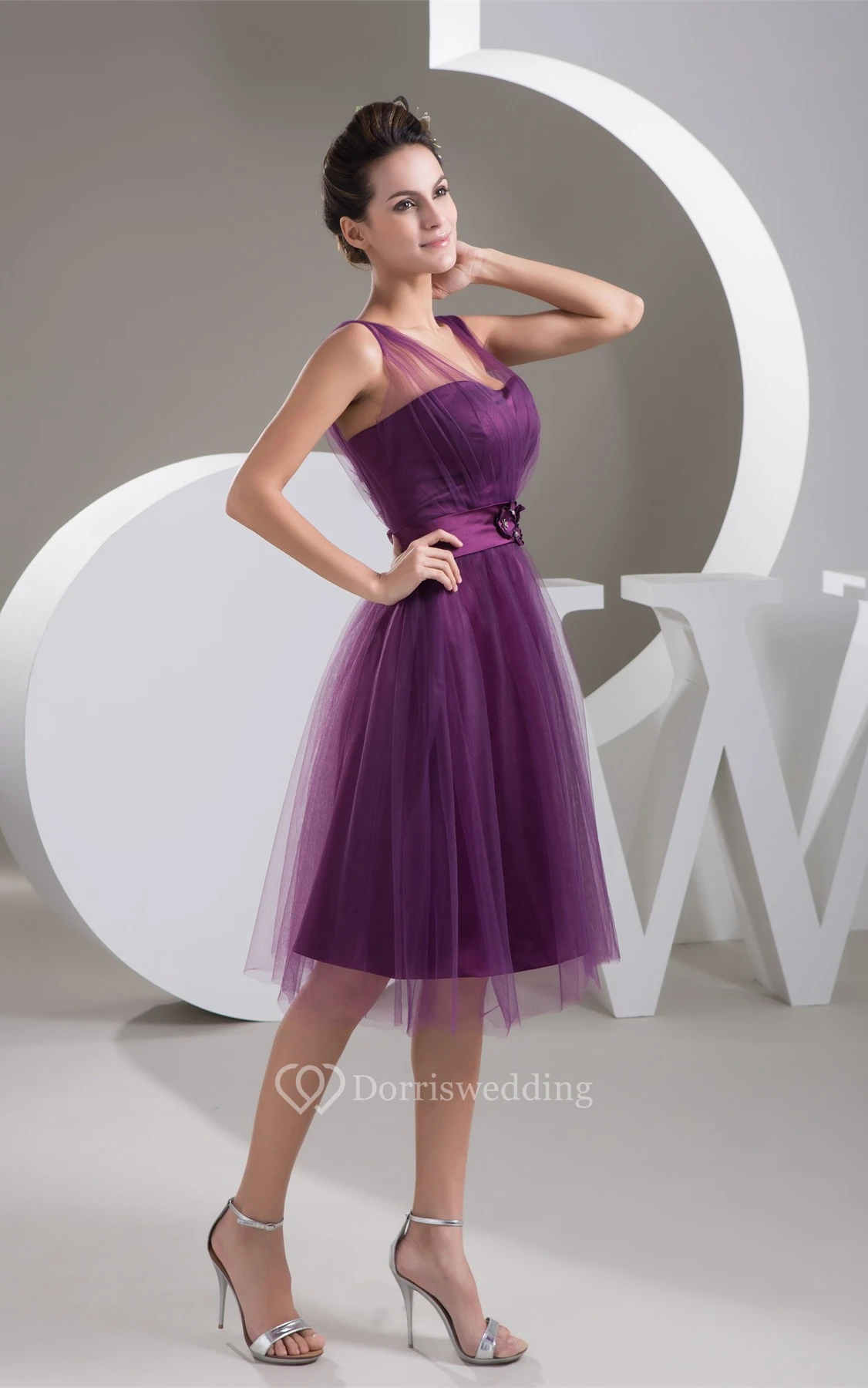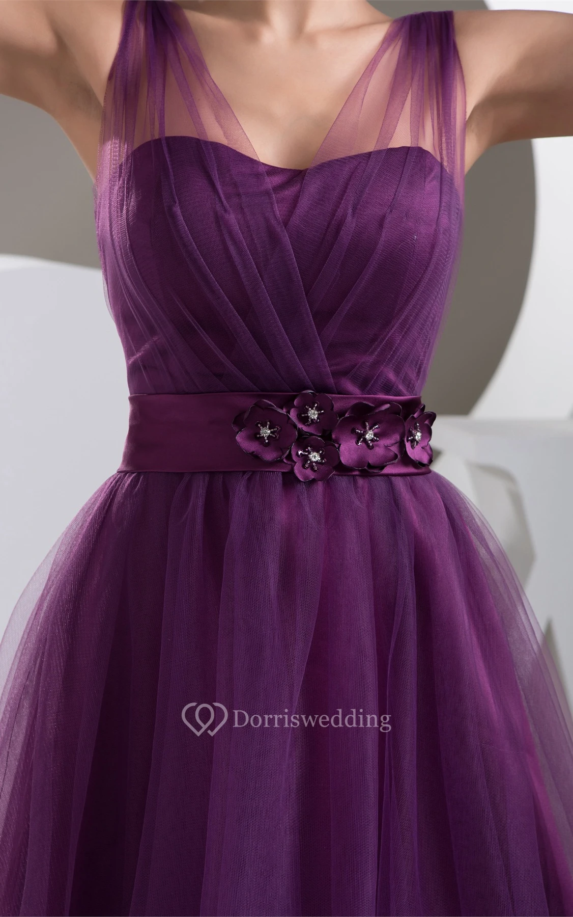 Strapped Knee-Length Tulle Dress With Floral Waist