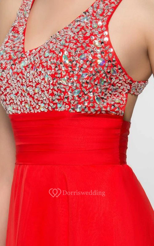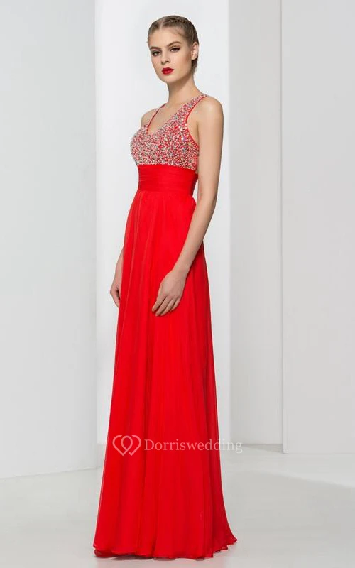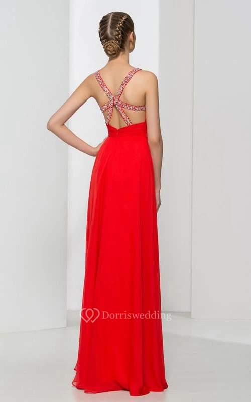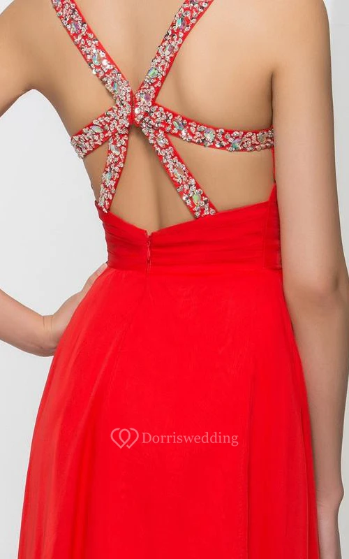 Straps Beading Pleats Criss-Cross Back Prom Dress