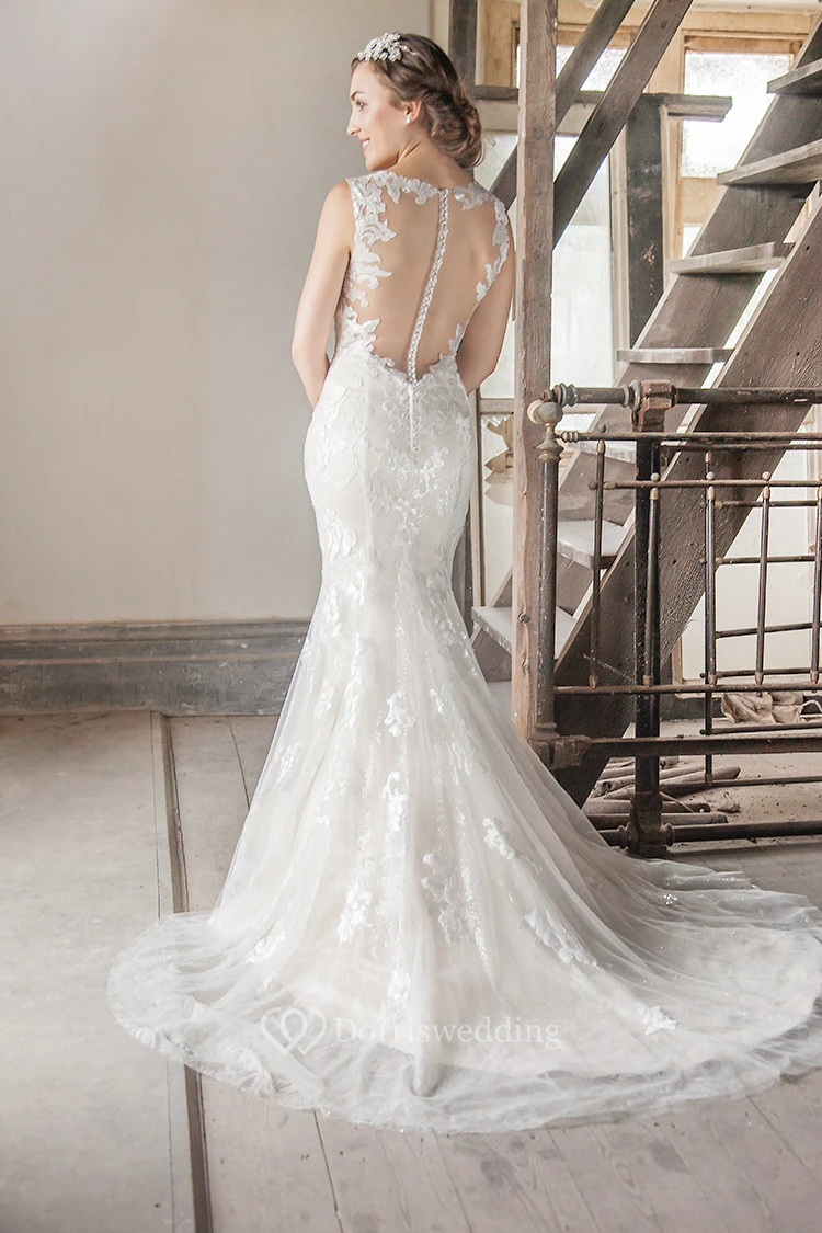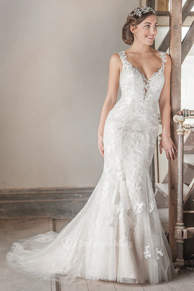 Straps Floor-Length Appliqued Tulle&Lace Wedding Dress With Court Train And Illusion