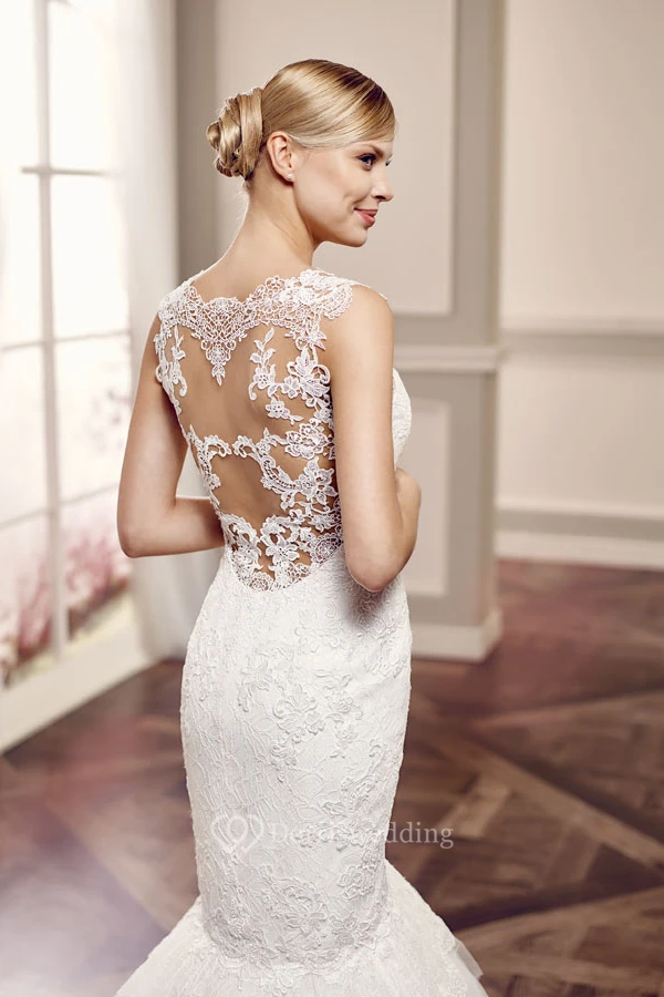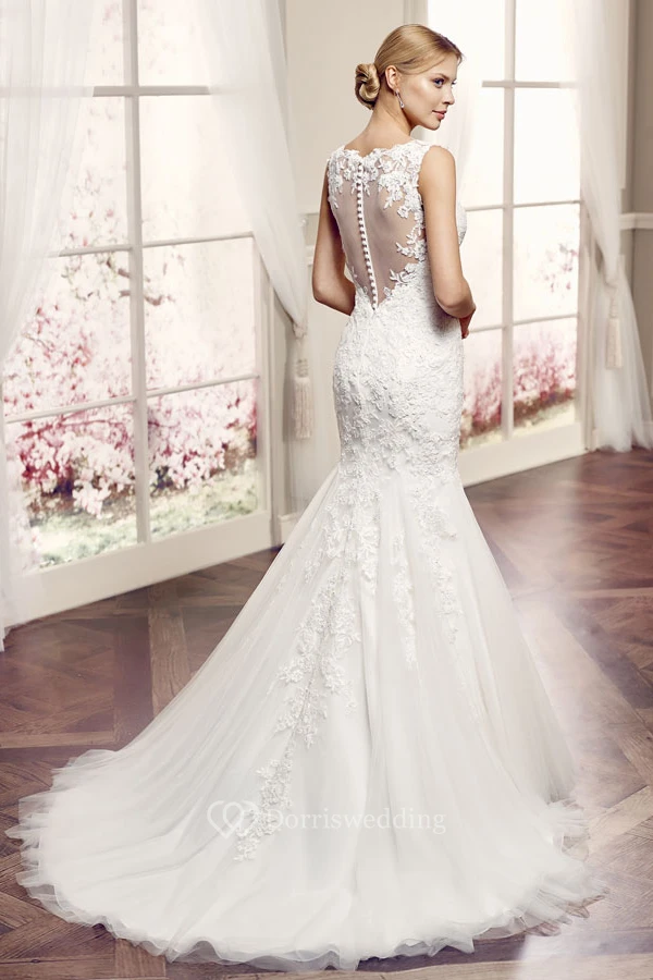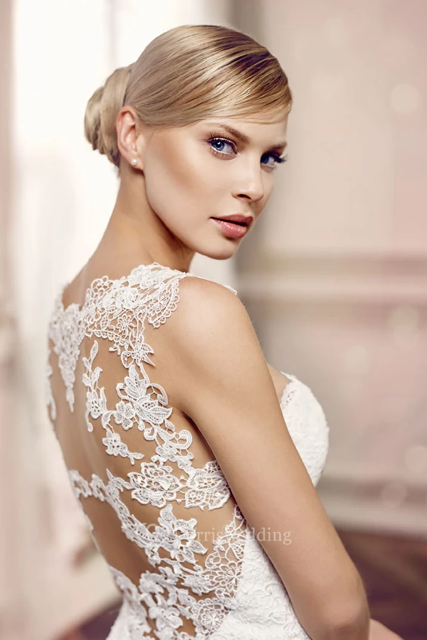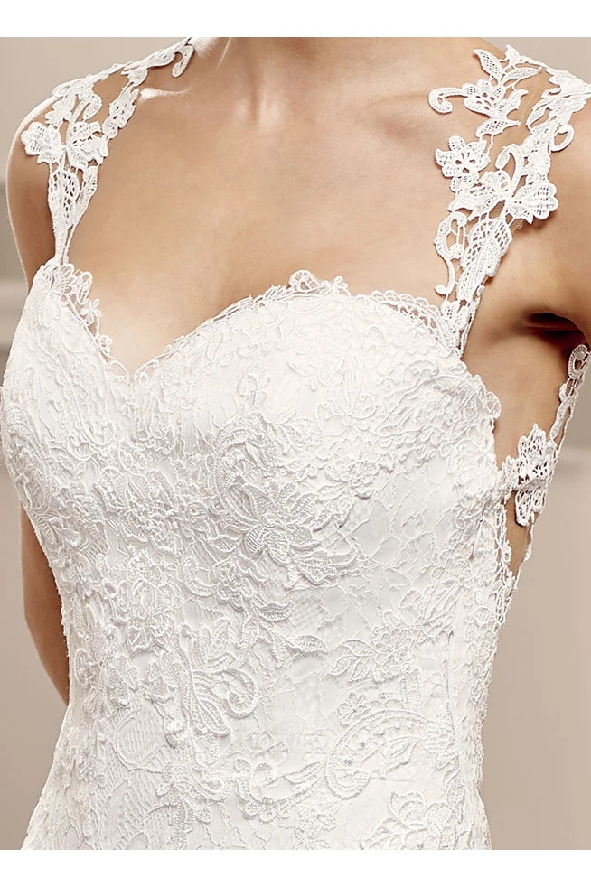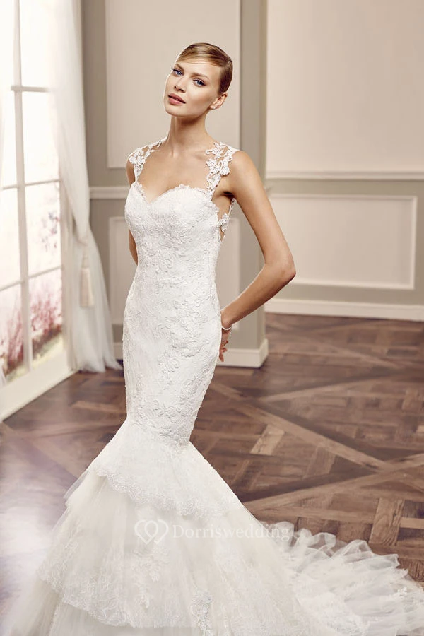 Straps Long Tiered Lace Wedding Dress With Appliques And Illusion