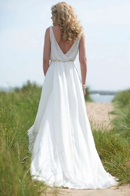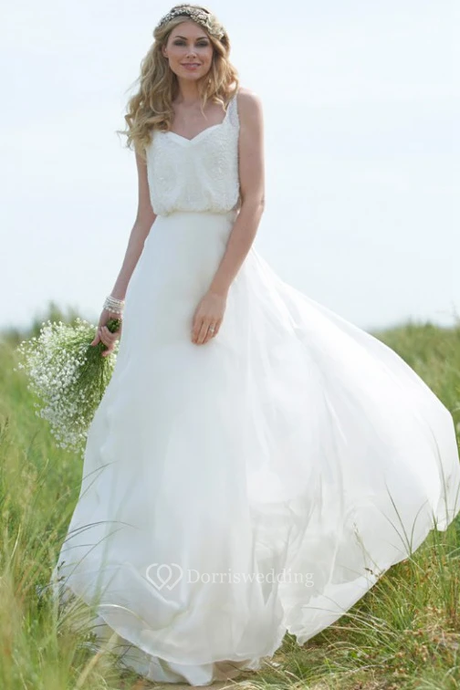 Straps Maxi Beaded Chiffon Wedding Dress With Sweep Train And V Back