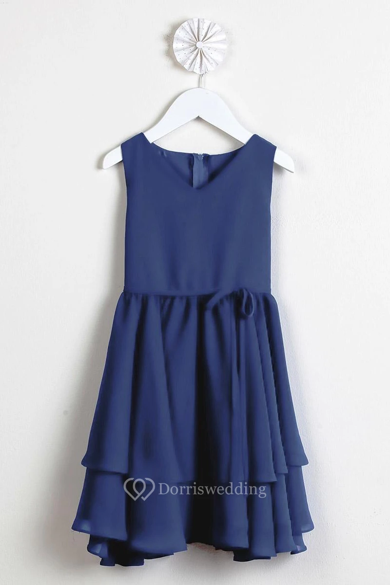 Straps Pleated Tiered Chiffon Flower Girl Dress With Sash